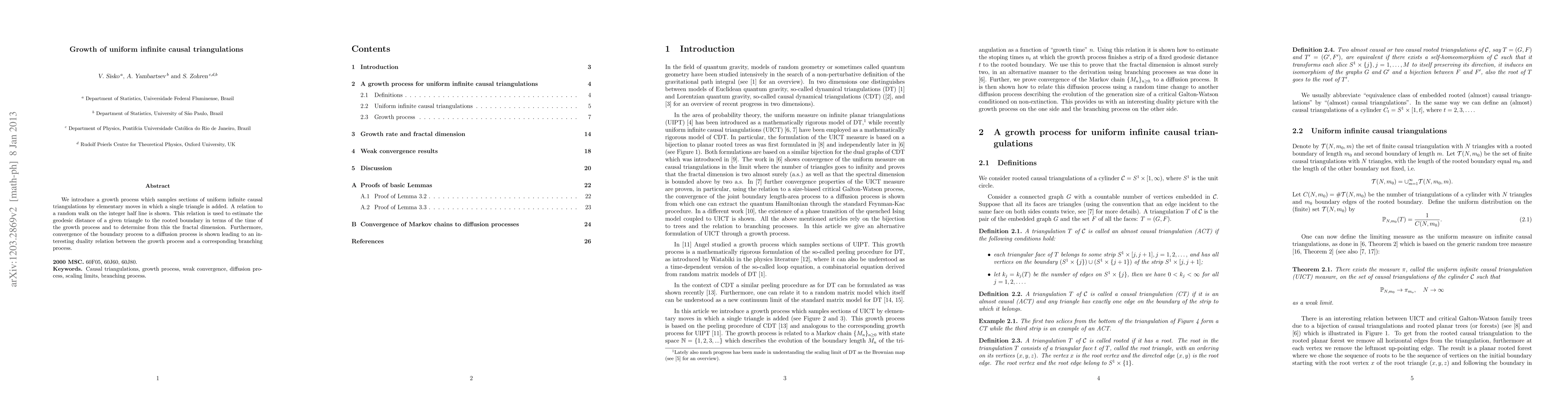 Researchers introduce a growth process for uniform infinite causal triangulations, relating it to a random walk on the integer half line, which helps estimate geodesic distance and fractal dimension. The process converges to a diffusion process, revealing an interesting duality relation with a corresponding branching process.