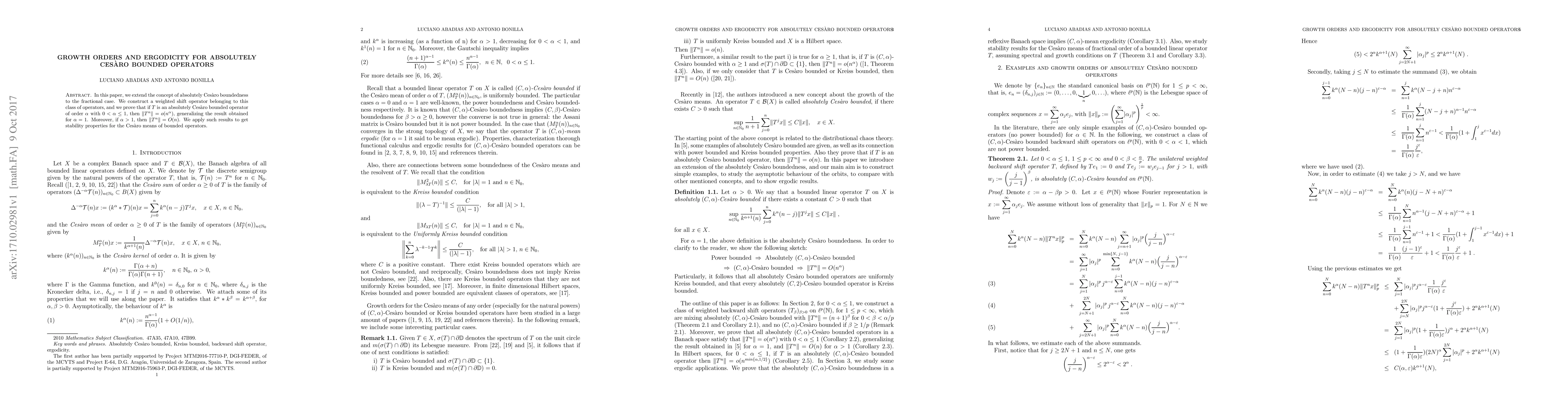 This paper extends the concept of absolutely Cesàro boundedness to fractional orders, constructs a weighted shift operator within this class, and proves that for operators of order $0<\alpha\le 1$, $\|T^n\|=o(n^{\alpha})$, while for $\alpha > 1$, $\|T^{n}\|= O(n)$. These results provide stability properties for the Cesàro means of bounded operators.