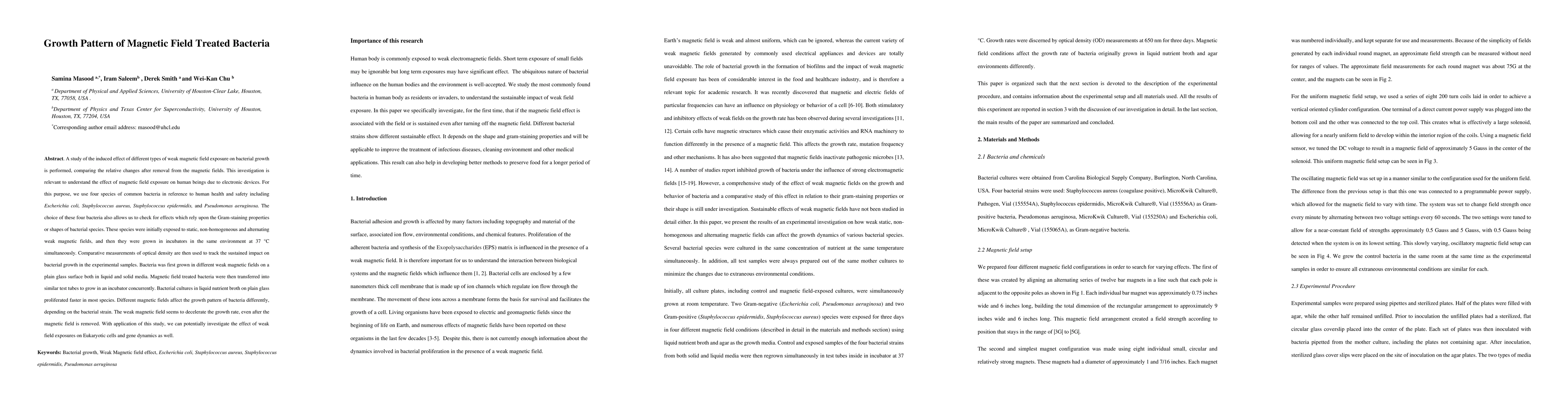 A study of the induced effect of different types of weak magnetic field exposure on bacterial growth is performed, comparing the relative changes after removal from the magnetic fields. This investigation is relevant to understand the effect of magnetic field exposure on human beings due to electronic devices. For this purpose, we use four species of common bacteria in reference to human health and safety including Escherichia coli, Staphylococcus aureus, Staphylococcus epidermidis, and Pseudomonas aeruginosa. The choice of these four bacteria also allows us to check for effects which rely upon the Gram-staining properties or shapes of bacterial species. These species were initially exposed to static, non-homogeneous and alternating weak magnetic fields, and then they were grown in incubators in the same environment at 37 {\deg}C simultaneously. Comparative measurements of optical density are then used to track the sustained impact on bacterial growth in the experimental samples. Bacteria was first grown in different weak magnetic fields on a plain glass surface both in liquid and solid media. Magnetic field treated bacteria were then transferred into similar test tubes to grow in an incubator concurrently. Bacterial cultures in liquid nutrient broth on plain glass proliferated faster in most species. Different magnetic fields affect the growth pattern of bacteria differently, depending on the bacterial strain. The weak magnetic field seems to decelerate the growth rate, even after the magnetic field is removed. With application of this study, we can potentially investigate the effect of weak field exposures on Eukaryotic cells and gene dynamics.