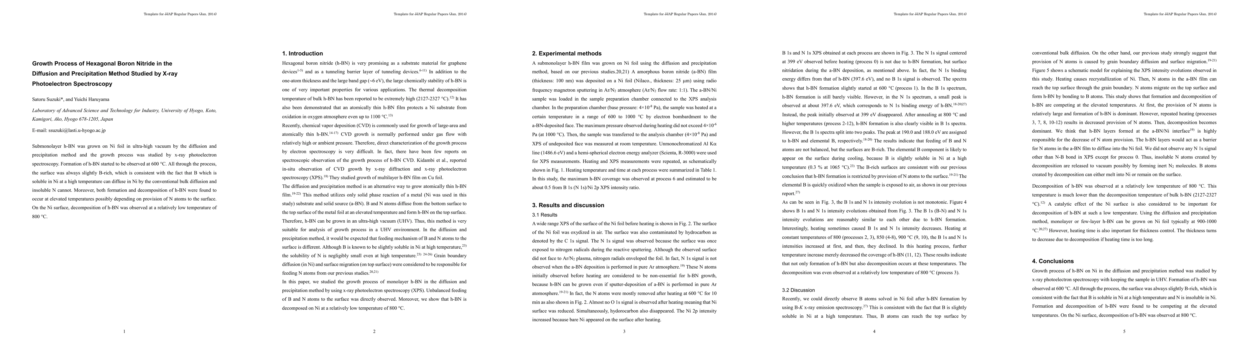 Submonolayer h-BN was grown on Ni foil in ultra-high vacuum by the diffusion and precipitation method and the growth process was studied by x-ray photoelectron spectroscopy. Formation of h-BN started to be observed at 600 C. All through the process, the surface was always slightly B-rich, which is consistent with the fact that B which is soluble in Ni at a high temperature can diffuse in Ni by the conventional bulk diffusion and insoluble N cannot. Moreover, both formation and decomposition of h-BN were found to occur at elevated temperatures possibly depending on provision of N atoms to the surface. On the Ni surface, decomposition of h-BN was observed at a relatively low temperature of 800 C.