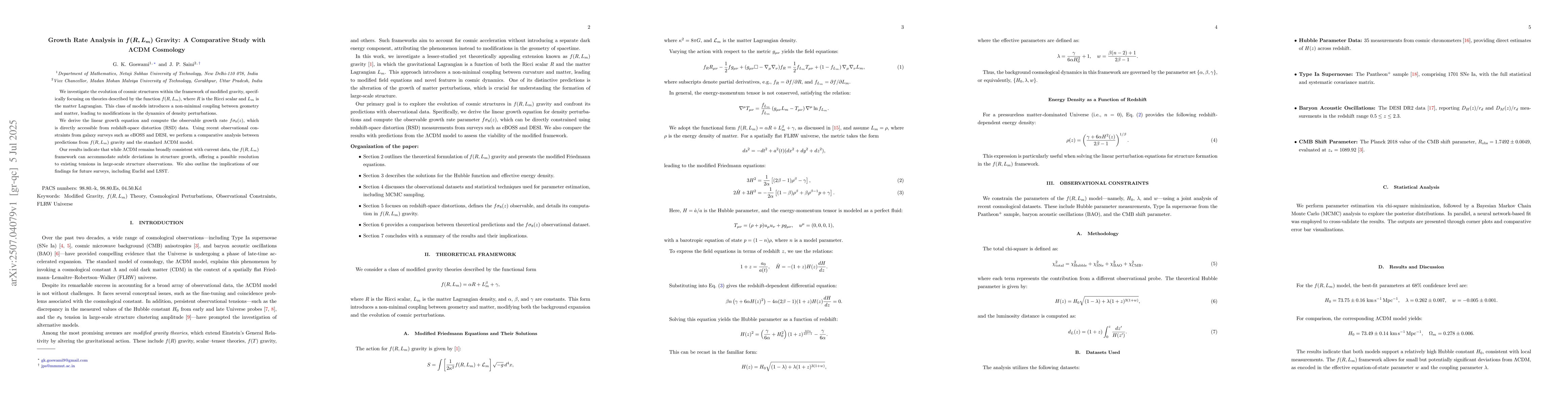 We investigate the evolution of cosmic structures within the framework of modified gravity, specifically focusing on theories described by the function $f(R, L_m)$, where $R$ is the Ricci scalar and $L_m$ is the matter Lagrangian. This class of models introduces a non-minimal coupling between geometry and matter, leading to modifications in the dynamics of density perturbations. We derive the linear growth equation and compute the observable growth rate $f\sigma_8(z)$, which is directly accessible from redshift-space distortion (RSD) data. Using recent observational constraints from galaxy surveys such as eBOSS and DESI, we perform a comparative analysis between predictions from $f(R, L_m)$ gravity and the standard $\Lambda$CDM model. Our results indicate that while $\Lambda$CDM remains broadly consistent with current data, the $f(R, L_m)$ framework can accommodate subtle deviations in structure growth, offering a possible resolution to existing tensions in large-scale structure observations. We also outline the implications of our findings for future surveys, including Euclid and LSST.