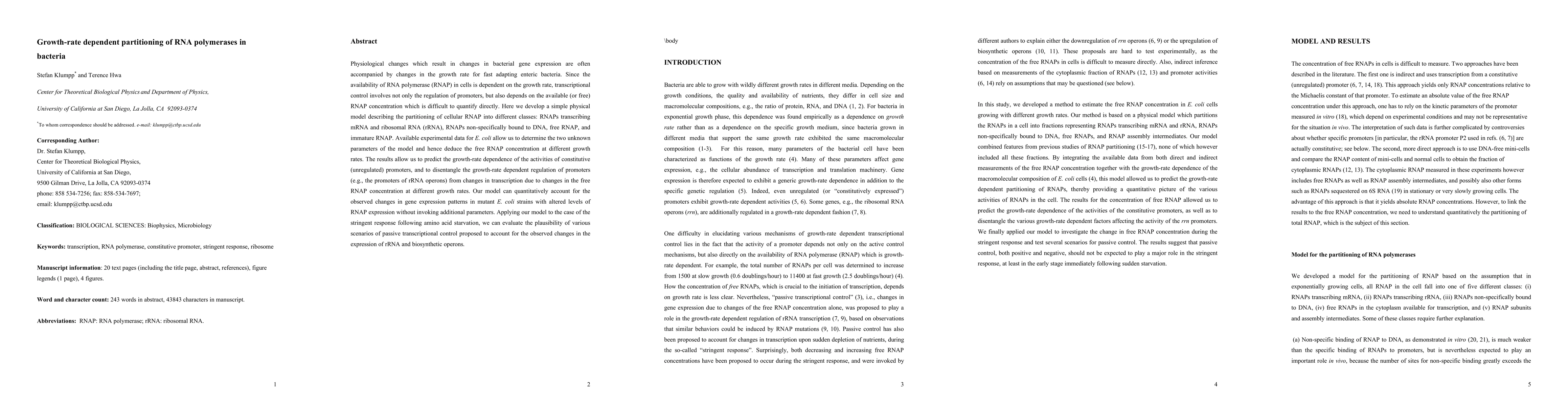 This paper develops a physical model to describe the partitioning of RNA polymerases in bacteria, focusing on how growth rate influences RNAP availability and gene expression. The model quantifies free RNAP concentration at different growth rates, enabling predictions of promoter activities and elucidating the regulation of rRNA operons, without requiring additional parameters.