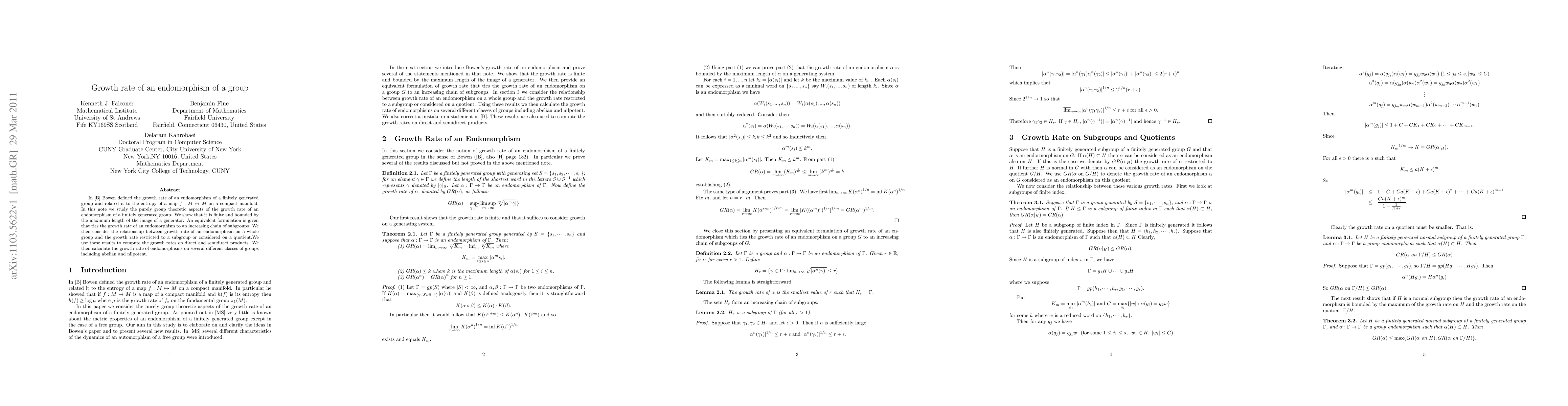 In [B] Bowen defined the growth rate of an endomorphism of a finitely generated group and related it to the entropy of a map $f:M \mapsto M$ on a compact manifold. In this note we study the purely group theoretic aspects of the growth rate of an endomorphism of a finitely generated group. We show that it is finite and bounded by the maximum length of the image of a generator. An equivalent formulation is given that ties the growth rate of an endomorphism to an increasing chain of subgroups. We then consider the relationship between growth rate of an endomorphism on a whole group and the growth rate restricted to a subgroup or considered on a quotient.We use these results to compute the growth rates on direct and semidirect products. We then calculate the growth rate of endomorphisms on several different classes of groups including abelian and nilpotent.