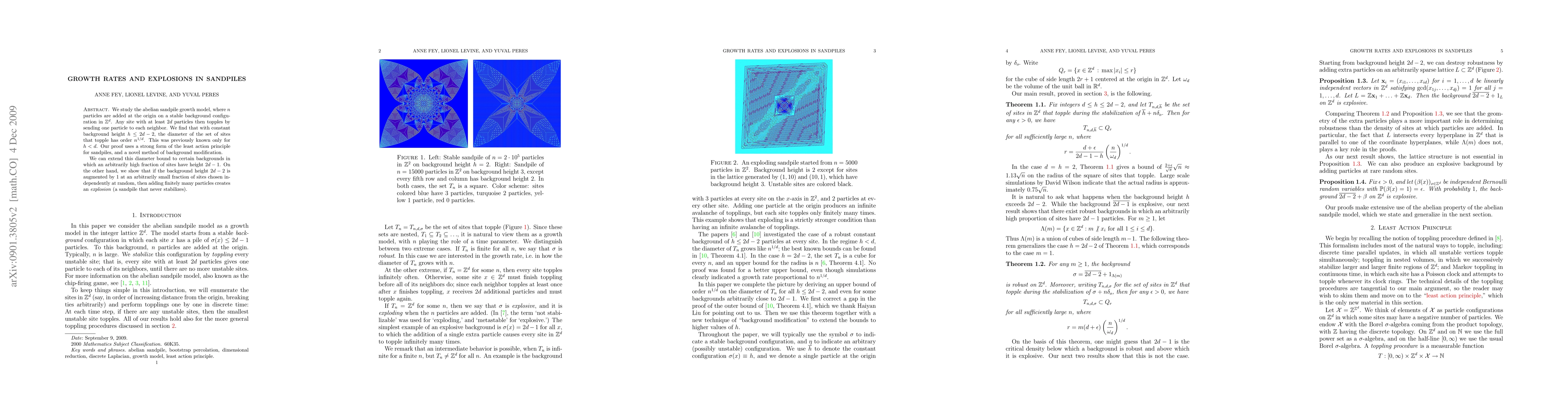 This paper investigates the growth dynamics in the abelian sandpile model, demonstrating that the diameter of toppling sites scales as n^{1/d} when the background height is h <= 2d-2, extending previous results. It also introduces a method for inducing sandpile explosions by randomly augmenting background height.