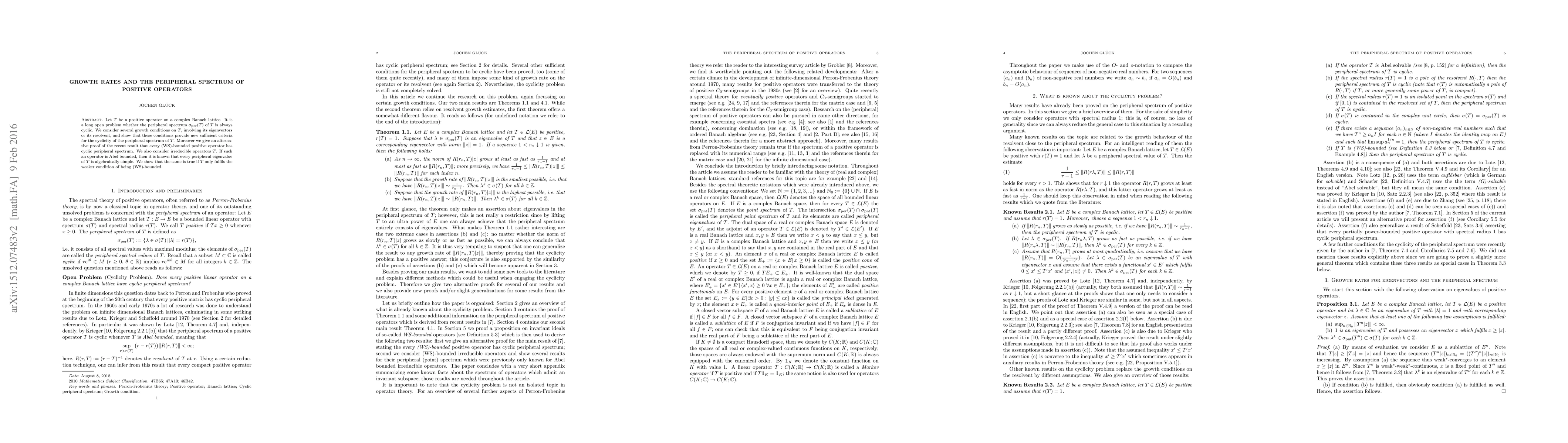 Let $T$ be a positive operator on a complex Banach lattice. It is a long open problem whether the peripheral spectrum $\sigma_{\operatorname{per}}(T)$ of $T$ is always cyclic. We consider several growth conditions on $T$, involving its eigenvectors or its resolvent, and show that these conditions provide new sufficient criteria for the cyclicity of the peripheral spectrum of $T$. Moreover we give an alternative proof of the recent result that every (WS)-bounded positive operator has cyclic peripheral spectrum. We also consider irreducible operators $T$. If such an operator is Abel bounded, then it is known that every peripheral eigenvalue of $T$ is algebraically simple. We show that the same is true if $T$ only fulfils the weaker condition of being (WS)-bounded.