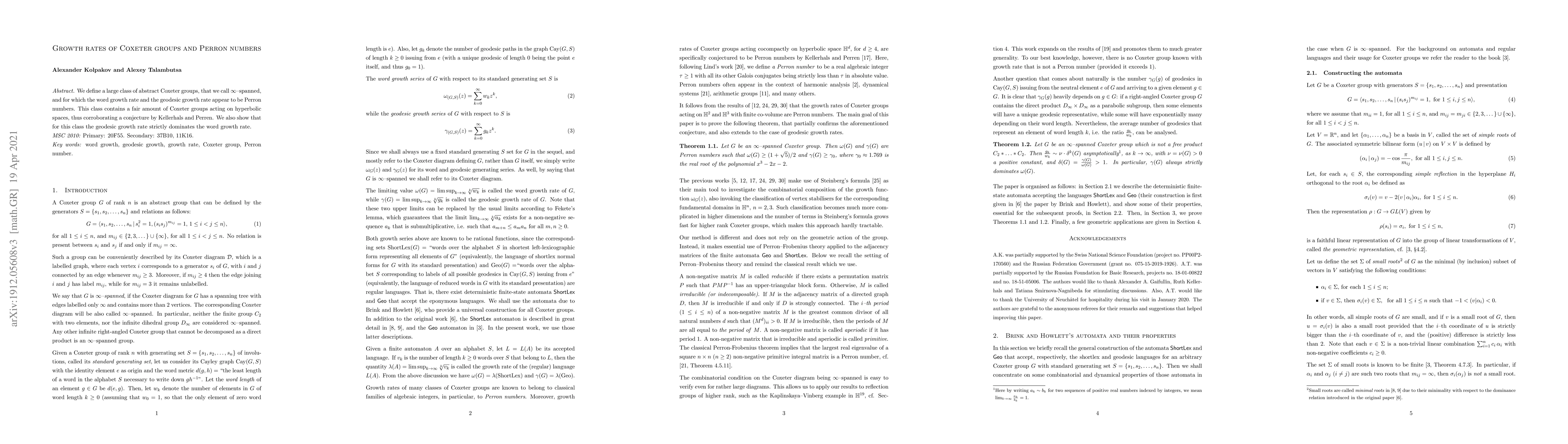 This paper explores $\infty$--spanned Coxeter groups, demonstrating that their word and geodesic growth rates are Perron numbers, supporting a conjecture by Kellerhals and Perren, and showing that geodesic growth rate exceeds word growth rate in this class.