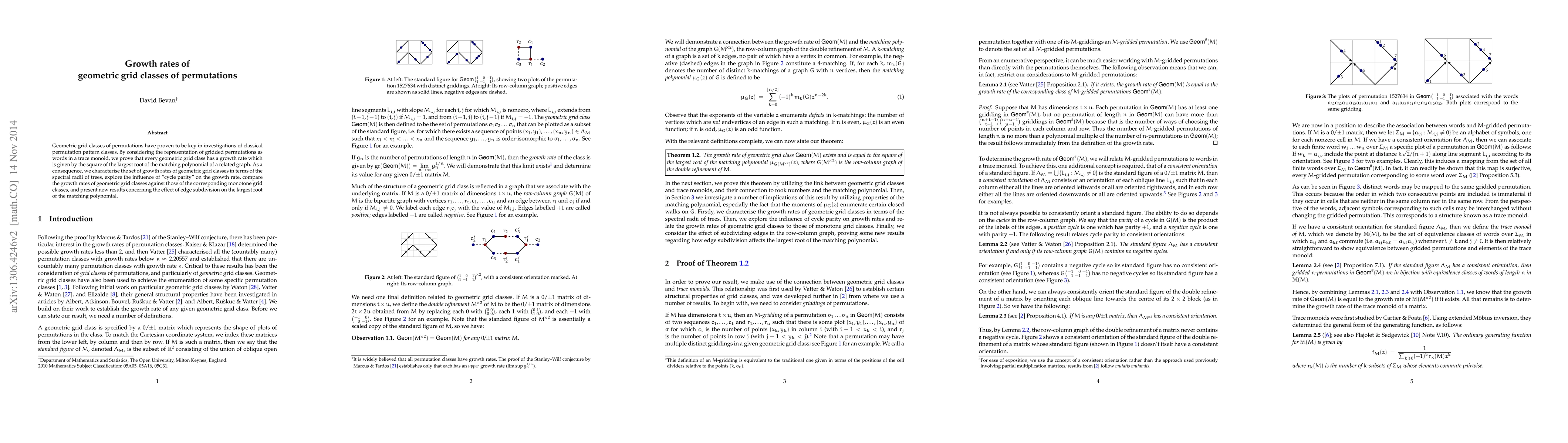 This paper investigates the growth rates of geometric grid classes of permutations, proving that each class's growth rate is the square of the largest root of a related graph's matching polynomial. It also explores the impact of cycle parity, compares growth rates with monotone grid classes, and examines the effect of edge subdivision on the largest root.