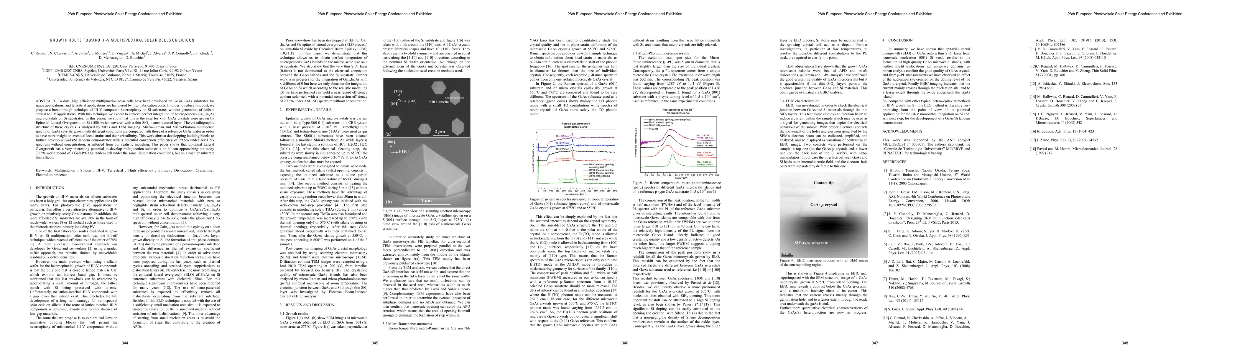 To date, high efficiency multijunction solar cells have been developed on Ge or GaAs substrates for space applications, and terrestrial applications are hampered by high fabrication costs. In order to reduce this cost, we propose a breakthrough technique of III-V compound heteroepitaxy on Si substrates without generation of defects critical to PV applications. With this technique we expect to achieve perfect integration of heterogeneous Ga1-xInxAs micro-crystals on Si substrates. In this paper, we show that this is the case for x=0. GaAs crystals were grown by Epitaxial Lateral Overgrowth on Si (100) wafers covered with a thin SiO2 nanostructured layer. The cristallographic structure of these crystals is analysed by MEB and TEM imaging. Micro-Raman and Micro-Photomuminescence spectra of GaAs crystals grown with different conditions are compared with those of a reference GaAs wafer in order to have more insight on eventual local strains and their cristallinity. This work aims at developping building blocks to further develop a GaAs/Si tandem demonstrator with a potential conversion efficiency of 29.6% under AM1.5G spectrum without concentration, as inferred from our realistic modeling. This paper shows that Epitaxial Lateral Overgrowth has a very interesting potential to develop multijunction solar cells on silicon approaching the today 30.3% world record of a GaInP/GaAs tandem cell under the same illumination conditions, but on a costlier substrate than silicon.