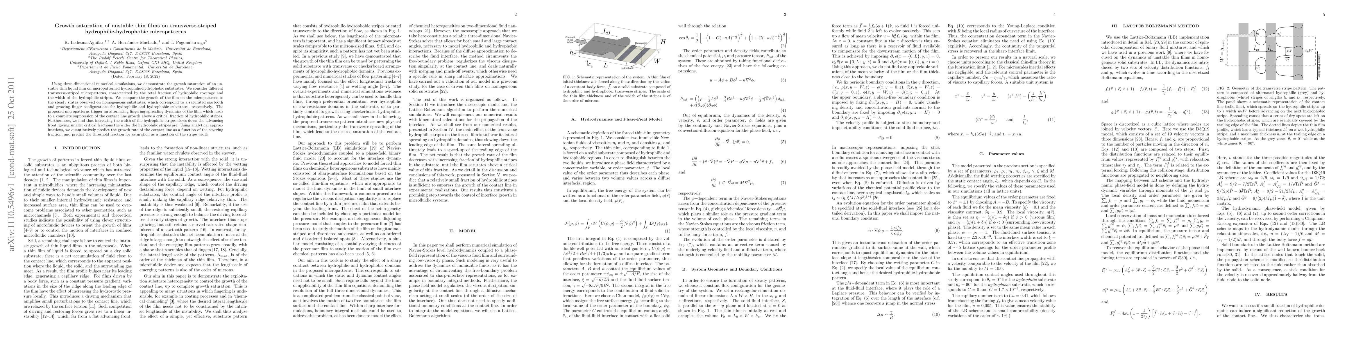 This paper uses simulations to study the growth saturation of unstable thin liquid films on micropatterned hydrophilic-hydrophobic surfaces. It finds that transverse-striped micropatterns suppress contact line growth above a critical hydrophilic fraction, with wider hydrophilic stripes slowing down the advancing front.