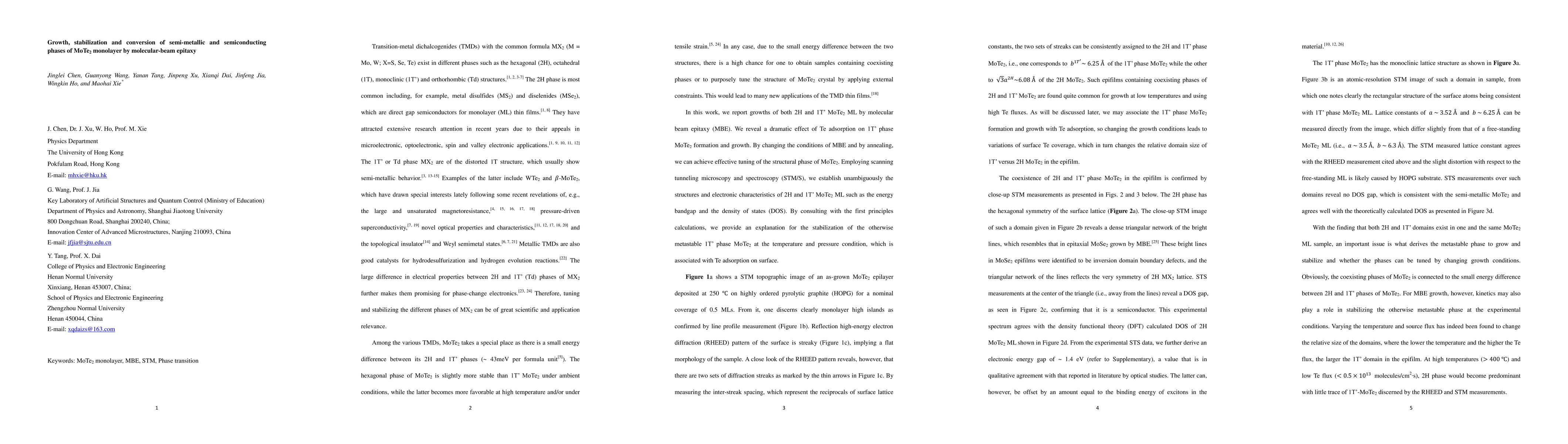 This paper reports the growth of both 2H and 1T' MoTe2 monolayers via molecular-beam epitaxy, demonstrating structural tunability through growth conditions and annealing. It highlights the role of Te surface adsorption in stabilizing the metastable 1T' phase, suggesting potential for new applications in phase-change electronics.