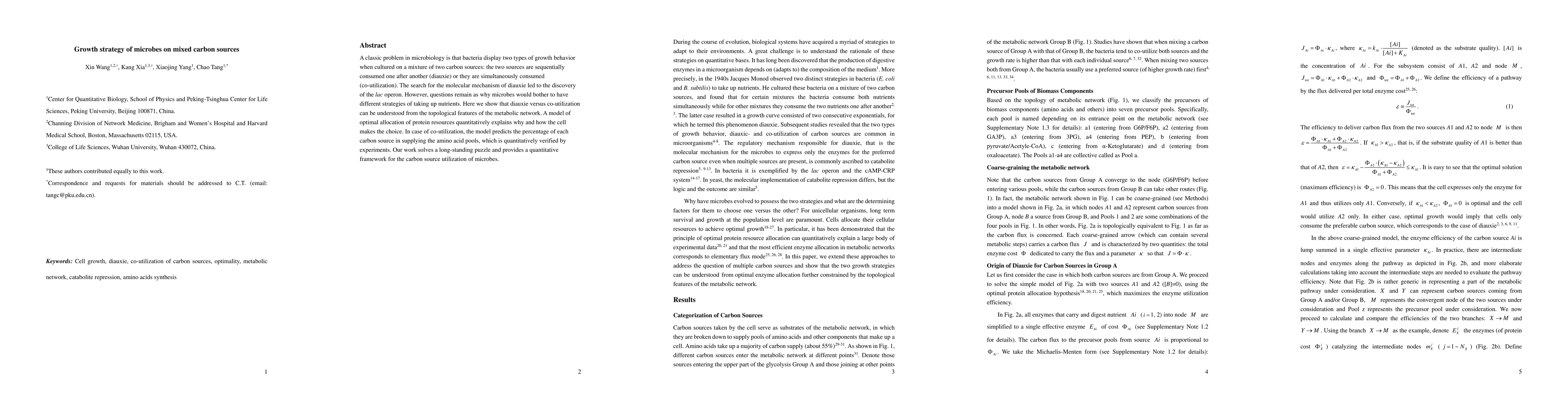 A classic problem in microbiology is that bacteria display two types of growth behavior when cultured on a mixture of two carbon sources: the two sources are sequentially consumed one after another (diauxie) or they are simultaneously consumed (co-utilization). The search for the molecular mechanism of diauxie led to the discovery of the lac operon. However, questions remain as why microbes would bother to have different strategies of taking up nutrients. Here we show that diauxie versus co-utilization can be understood from the topological features of the metabolic network. A model of optimal allocation of protein resources quantitatively explains why and how the cell makes the choice. In case of co-utilization, the model predicts the percentage of each carbon source in supplying the amino acid pools, which is quantitatively verified by experiments. Our work solves a long-standing puzzle and provides a quantitative framework for the carbon source utilization of microbes.