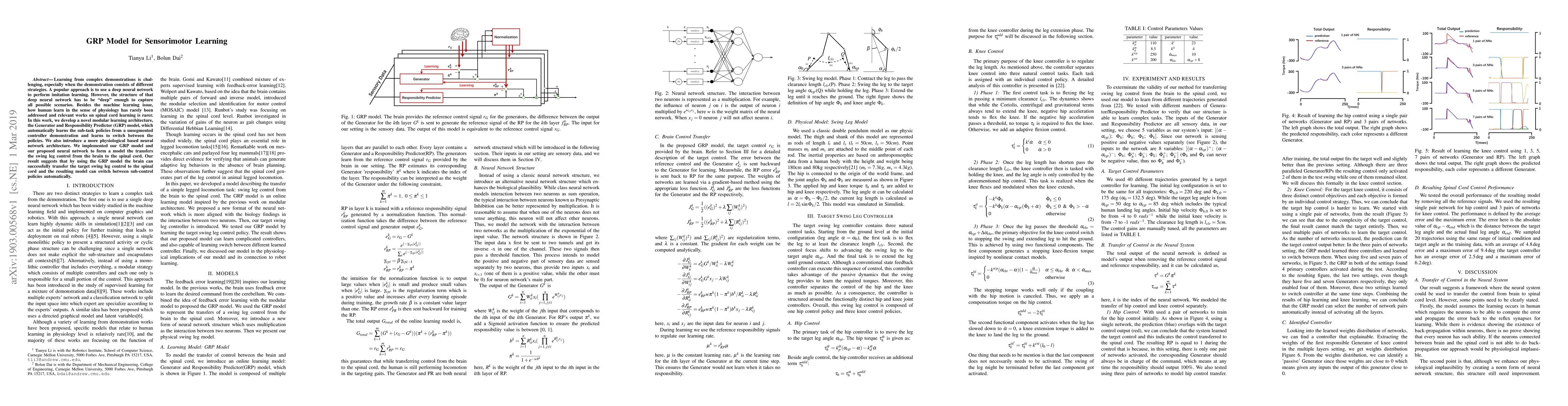 Learning from complex demonstrations is challenging, especially when the demonstration consists of different strategies. A popular approach is to use a deep neural network to perform imitation learning. However, the structure of that deep neural network has to be ``deep" enough to capture all possible scenarios. Besides the machine learning issue, how humans learn in the sense of physiology has rarely been addressed and relevant works on spinal cord learning are rarer. In this work, we develop a novel modular learning architecture, the Generator and Responsibility Predictor (GRP) model, which automatically learns the sub-task policies from an unsegmented controller demonstration and learns to switch between the policies. We also introduce a more physiological based neural network architecture. We implemented our GRP model and our proposed neural network to form a model the transfers the swing leg control from the brain to the spinal cord. Our result suggests that by using the GRP model the brain can successfully transfer the target swing leg control to the spinal cord and the resulting model can switch between sub-control policies automatically.