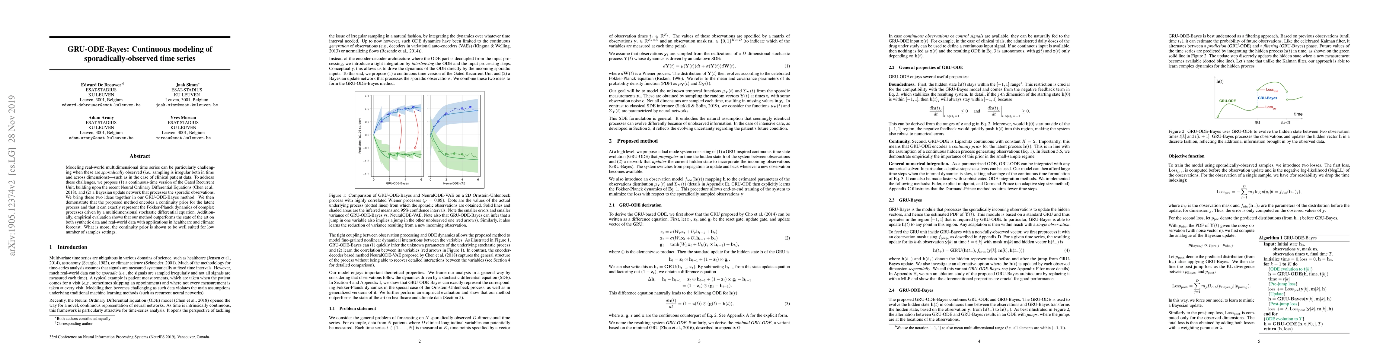 Modeling real-world multidimensional time series can be particularly challenging when these are sporadically observed (i.e., sampling is irregular both in time and across dimensions)-such as in the case of clinical patient data. To address these challenges, we propose (1) a continuous-time version of the Gated Recurrent Unit, building upon the recent Neural Ordinary Differential Equations (Chen et al., 2018), and (2) a Bayesian update network that processes the sporadic observations. We bring these two ideas together in our GRU-ODE-Bayes method. We then demonstrate that the proposed method encodes a continuity prior for the latent process and that it can exactly represent the Fokker-Planck dynamics of complex processes driven by a multidimensional stochastic differential equation. Additionally, empirical evaluation shows that our method outperforms the state of the art on both synthetic data and real-world data with applications in healthcare and climate forecast. What is more, the continuity prior is shown to be well suited for low number of samples settings.