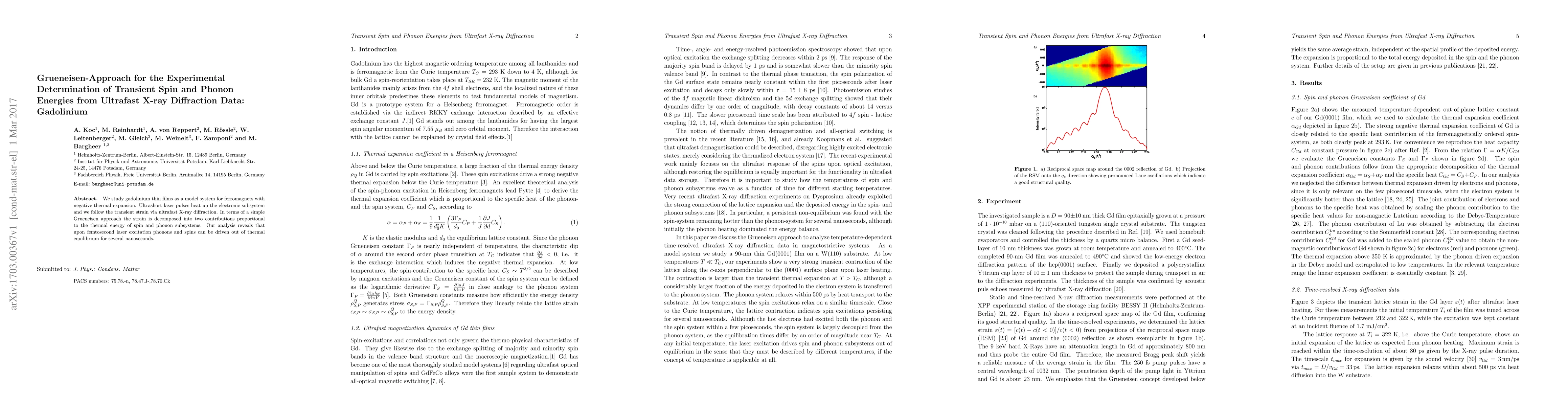 This study uses ultrafast X-ray diffraction to investigate transient spin and phonon energies in gadolinium thin films, employing a Grueneisen approach to separate contributions from thermal energy in spin and phonon subsystems. The results show that femtosecond laser excitation can drive phonons and spins out of thermal equilibrium for several nanoseconds.