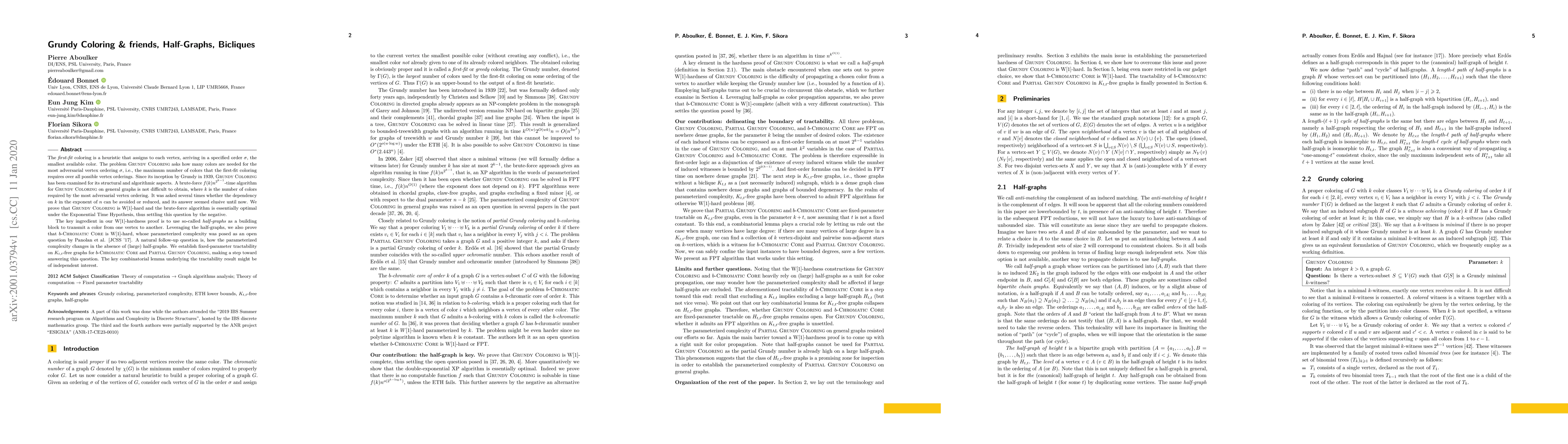 The first-fit coloring is a heuristic that assigns to each vertex, arriving in a specified order $\sigma$, the smallest available color. The problem Grundy Coloring asks how many colors are needed for the most adversarial vertex ordering $\sigma$, i.e., the maximum number of colors that the first-fit coloring requires over all possible vertex orderings. Since its inception by Grundy in 1939, Grundy Coloring has been examined for its structural and algorithmic aspects. A brute-force $f(k)n^{2^{k-1}}$-time algorithm for Grundy Coloring on general graphs is not difficult to obtain, where $k$ is the number of colors required by the most adversarial vertex ordering. It was asked several times whether the dependency on $k$ in the exponent of $n$ can be avoided or reduced, and its answer seemed elusive until now. We prove that Grundy Coloring is W[1]-hard and the brute-force algorithm is essentially optimal under the Exponential Time Hypothesis, thus settling this question by the negative. The key ingredient in our W[1]-hardness proof is to use so-called half-graphs as a building block to transmit a color from one vertex to another. Leveraging the half-graphs, we also prove that b-Chromatic Core is W[1]-hard, whose parameterized complexity was posed as an open question by Panolan et al. [JCSS '17]. A natural follow-up question is, how the parameterized complexity changes in the absence of (large) half-graphs. We establish fixed-parameter tractability on $K_{t,t}$-free graphs for b-Chromatic Core and Partial Grundy Coloring, making a step toward answering this question. The key combinatorial lemma underlying the tractability result might be of independent interest.