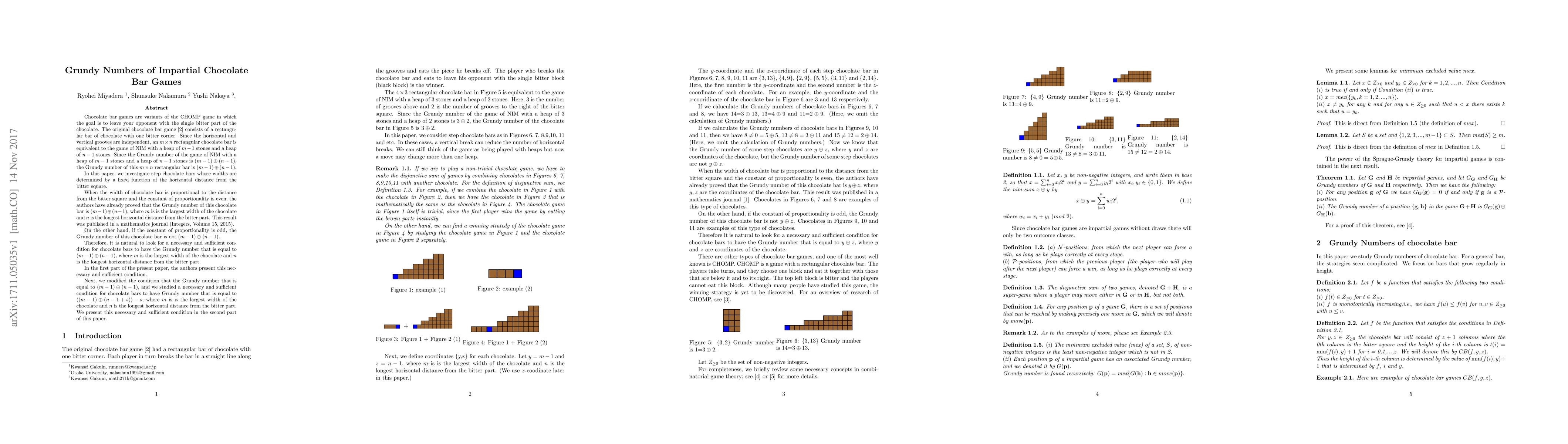 Chocolate bar games are variants of the CHOMP game in which the goal is to leave your opponent with the single bitter part of the chocolate. In this paper, we investigate step chocolate bars whose widths are determined by a fixed function of the horizontal distance from the bitter square. When the width of chocolate bar is proportional to the distance from the bitter square and the constant of proportionality is even, the authors have already proved that the Grundy number of this chocolate bar is $(m-1) \oplus (n-1)$, where $m$ is is the largest width of the chocolate and $n$ is the longest horizontal distance from the bitter part. This result was published in a mathematics journal(Integers,15, 2015). On the other hand, if the constant of proportionality is odd, the Grundy number of this chocolate bar is not $(m-1) \oplus (n-1)$. Therefore, it is natural to look for a necessary and sufficient condition for chocolate bars to have the Grundy number that is equal to $(m-1) \oplus (n-1)$, where $m$ is the largest width of the chocolate and $n$ is the longest horizontal distance from the bitter part. In the first part of the present paper, the authors present this necessary and sufficient condition. Next, we modified the condition that the Grundy number that is equal to $(m-1) \oplus (n-1)$, and we studied a necessary and sufficient condition for chocolate bars to have Grundy number that is equal to $((m-1) \oplus (n-1+s))-s$, where $m$ is is the largest width of the chocolate and $n$ is the longest horizontal distance from the bitter part. We present this necessary and sufficient condition in the second part of this paper.