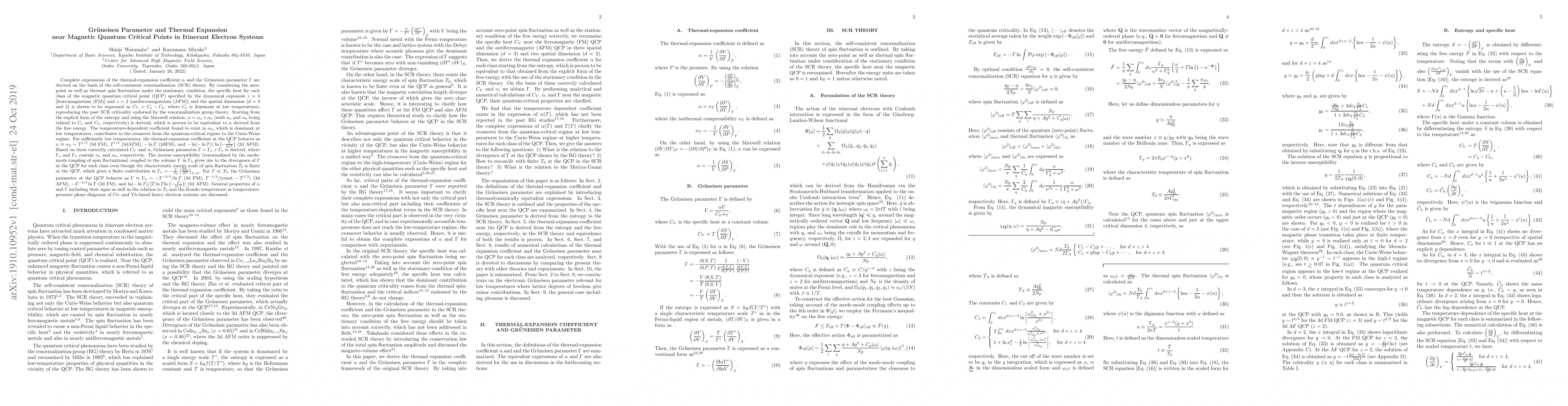 Complete expressions of the thermal-expansion coefficient $\alpha$ and the Gr\"{u}neisen parameter $\Gamma$ are derived on the basis of the self-consistent renormalization (SCR) theory. By considering zero-point as well as thermal spin fluctuation under the stationary condition, the specific heat for each class of the magnetic quantum critical point (QCP) specified by the dynamical exponent $z=3$ (FM) and $z=2$ (AFM) and the spatial dimension ($d=3$ and $2$) is shown to be expressed as $C_{V}=C_a-C_b$, where $C_a$ is dominant at low temperatures, reproducing the past SCR criticality endorsed by the renormalization group theory. Starting from the explicit form of the entropy and using the Maxwell relation, $\alpha=\alpha_a+\alpha_b$ (with $\alpha_a$ and $\alpha_b$ being related to $C_a$ and $C_b$, respectively) is derived, which is proven to be equivalent to $\alpha$ derived from the free energy. The temperature-dependent coefficient found to exist in $\alpha_b$, which is dominant at low temperatures, contributes to the crossover from the quantum-critical regime to the Curie-Weiss regime and even affects the quantum criticality at 2d AFM QCP. Based on these correctly calculated $C_{V}$ and $\alpha$, Gr\"{u}neisen parameter $\Gamma=\Gamma_a+\Gamma_b$ is derived, where $\Gamma_a$ and $\Gamma_b$ contain $\alpha_a$ and $\alpha_b$, respectively. The inverse susceptibility coupled to the volume $V$ in $\Gamma_b$ gives rise to divergence of $\Gamma$ at the QCP for each class even though characteristic energy scale of spin fluctuation $T_0$ is finite at the QCP, which gives a finite contribution in $\Gamma_a=-\frac{V}{T_0}\left(\frac{\partial T_0}{\partial V}\right)_{T=0}$. General properties of $\alpha$ and $\Gamma$ including their signs as well as the relation to $T_0$ and the Kondo temperature in temperature-pressure phase diagrams of Ce- and Yb-based heavy electron systems are discussed.
