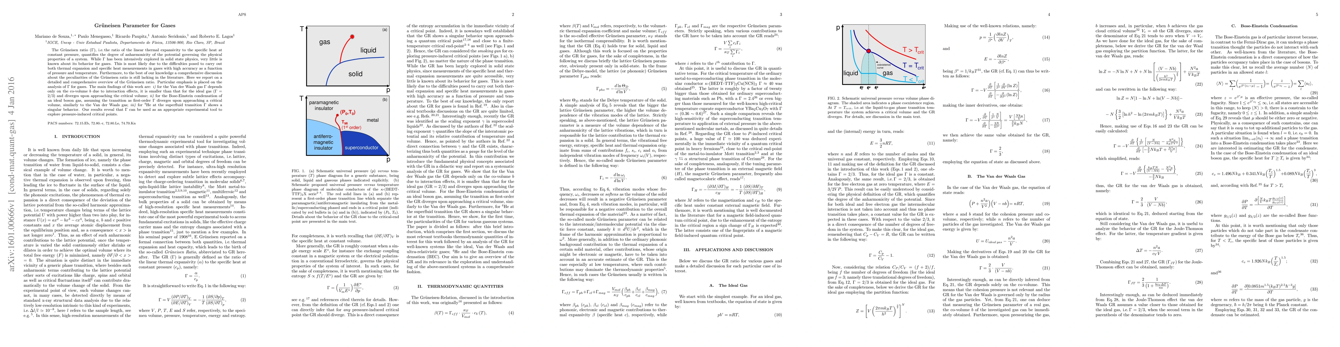 This paper provides a detailed overview of the Grüneisen ratio ($\Gamma$) for gases, highlighting its dependence on specific gas behaviors. Key findings include that for Van der Waals gases, $\Gamma$ varies with interaction effects and diverges near the critical volume, while for Bose-Einstein condensation and superfluid $^4$He, $\Gamma$ also exhibits singular behavior near critical transitions.