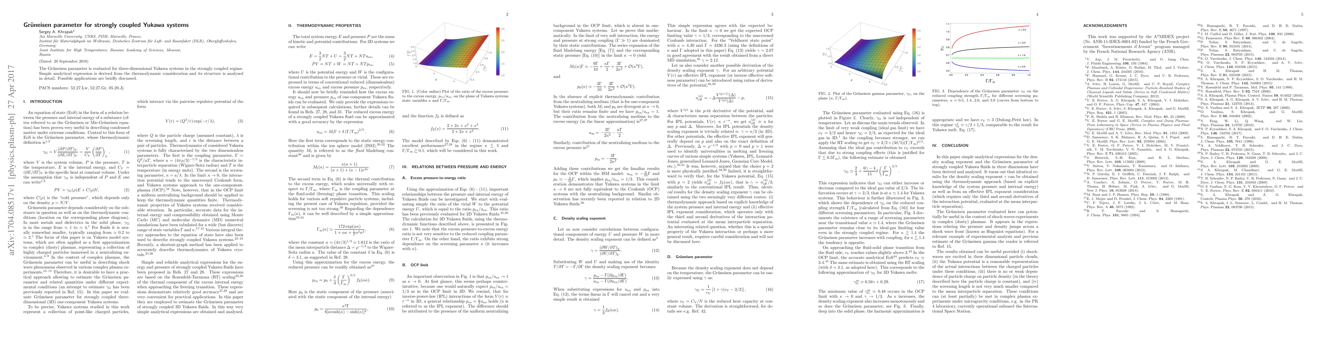 This paper evaluates the Gr\"uneisen parameter for strongly coupled three-dimensional Yukawa systems, deriving a simple analytical expression from thermodynamic considerations and analyzing its structure in detail. Potential applications of this parameter are briefly discussed.