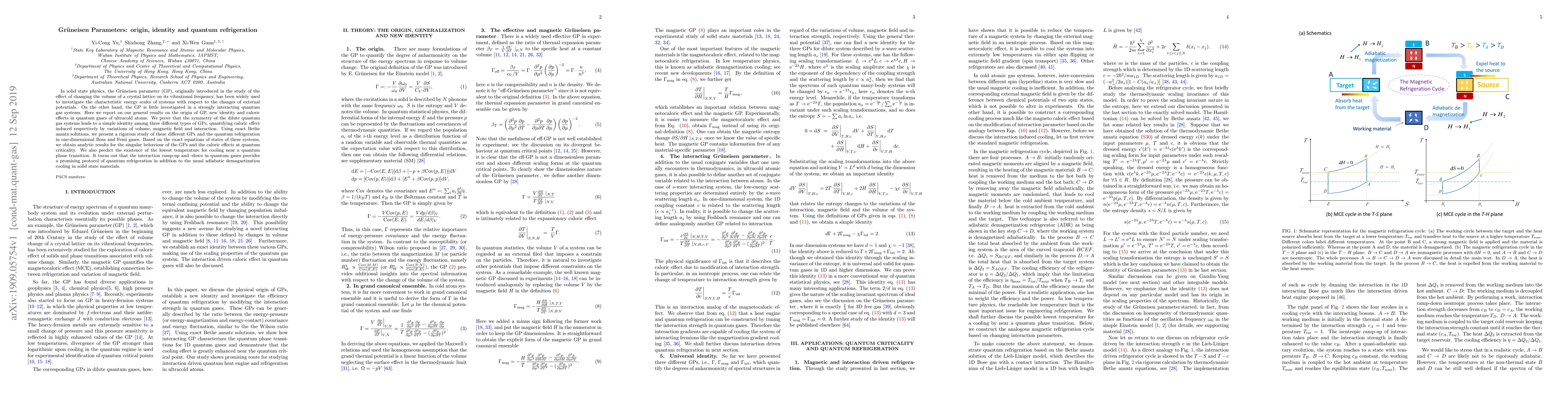 In solid state physics, the Gr\"{u}neisen parameter (GP), originally introduced in the study of the effect of changing the volume of a crystal lattice on its vibrational frequency, has been widely used to investigate the characteristic energy scales of systems with respect to the changes of external potentials. On the other hand, the GP is little investigated in a strongly interacting quantum gas systems. Here we report on our general results on the origin of GP, new identity and caloric effects in quantum gases of ultracold atoms. We prove that the symmetry of the dilute quantum gas systems leads to a simple identity among three different types of GPs, quantifying caloric effect induced respectively by variations of volume, magnetic field and interaction. Using exact Bethe ansatz solutions, we present a rigorous study of these different GPs and the quantum refrigeration in one-dimensional Bose and Femi gases. Based on the exact equations of states of these systems, we obtain analytic results for the singular behaviour of the GPs and the caloric effects at quantum criticality. We also predict the existence of the lowest temperature for cooling near a quantum phase transition. It turns out that the interaction ramp-up and -down in quantum gases provides a promising protocol of quantum refrigeration in addition to the usual adiabatic demagnetization cooling in solid state materials.