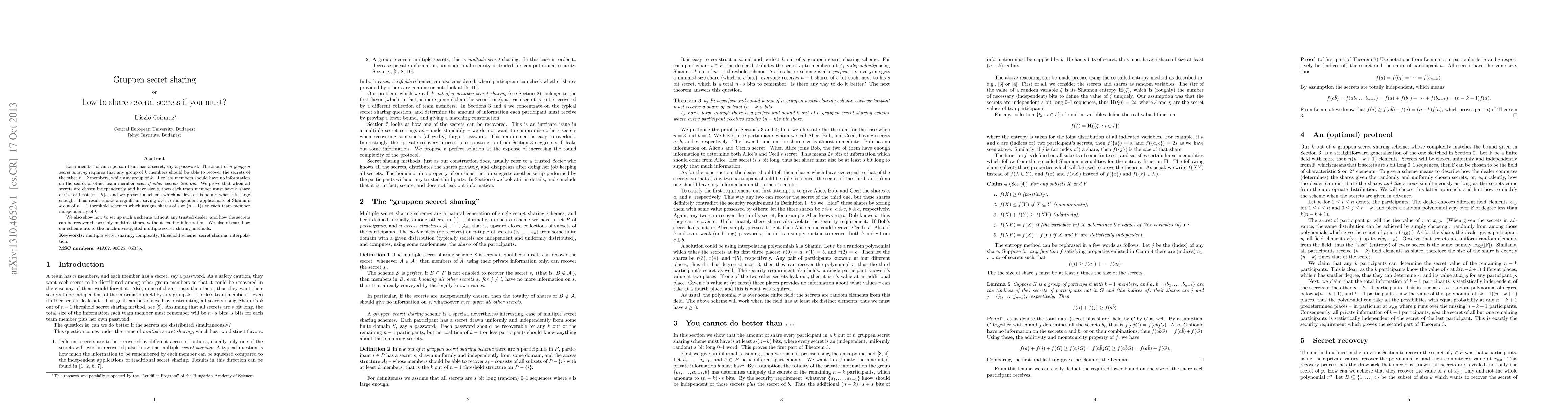 Each member of an $n$-person team has a secret, say a password. The $k$ out of $n$ gruppen secret sharing requires that any group of $k$ members should be able to recover the secrets of the other $n-k$ members, while any group of $k-1$ or less members should have no information on the secret of other team member even if other secrets leak out. We prove that when all secrets are chosen independently and have size $s$, then each team member must have a share of size at least $(n-k)s$, and we present a scheme which achieves this bound when $s$ is large enough. This result shows a significant saving over $n$ independent applications of Shamir's $k$ out of $n-1$ threshold schemes which assigns shares of size $(n-1)s$ to each team member independently of $k$. We also show how to set up such a scheme without any trusted dealer, and how the secrets can be recovered, possibly multiple times, without leaking information. We also discuss how our scheme fits to the much-investigated multiple secret sharing methods.