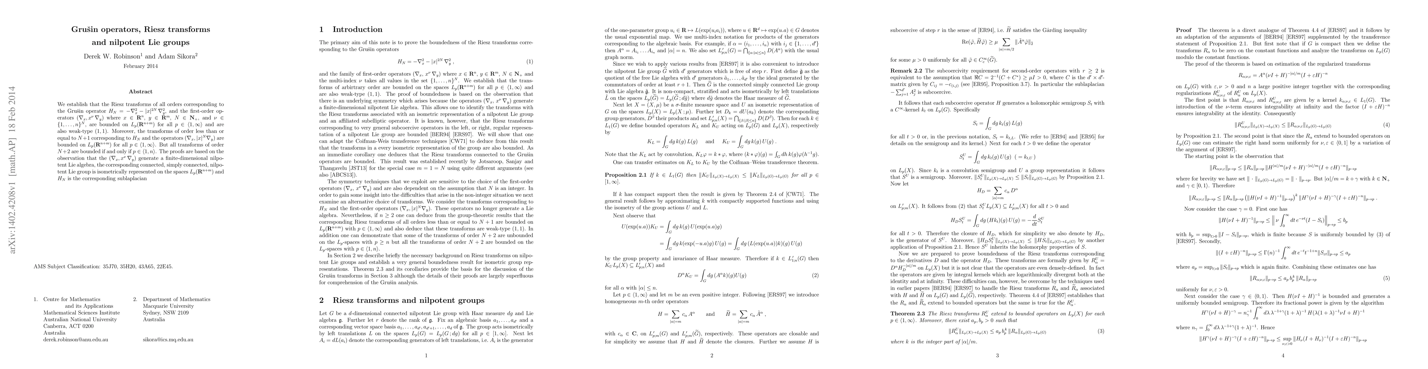 We establish that the Riesz transforms of all orders corresponding to the Gru\v{s}in operator $H_N=-\nabla_{x}^2-|x|^{2N}\,\nabla_{y}^2$, and the first-order operators $(\nabla_{x},x^\nu\,\nabla_{y})$ where $x\in \Ri^n$, $y\in\Ri^m$, $N\in\Ni_+$, and $\nu\in\{1,\ldots,n\}^N$, are bounded on $L_p(\Ri^{n+m})$ for all $p\in\langle1,\infty\rangle$ and are also weak-type $(1,1)$. Moreover, the transforms of order less than or equal to $N+1$ corresponding to $H_N$ and the operators $(\nabla_{x}, |x|^N\nabla_{y})$ are bounded on $L_p(\Ri^{n+m})$ for all $p\in\langle1,\infty\rangle$. But all transforms of order $N+2$ are bounded if and only if $p\in\langle1,n\rangle$. The proofs are based on the observation that the $(\nabla_{x},x^\nu\,\nabla_{y})$ generate a finite-dimensional nilpotent Lie algebra, the corresponding connected, simply connected, nilpotent Lie group is isometrically represented on the spaces $L_p(\Ri^{n+m})$ and $H_N$ is the corresponding sublaplacian