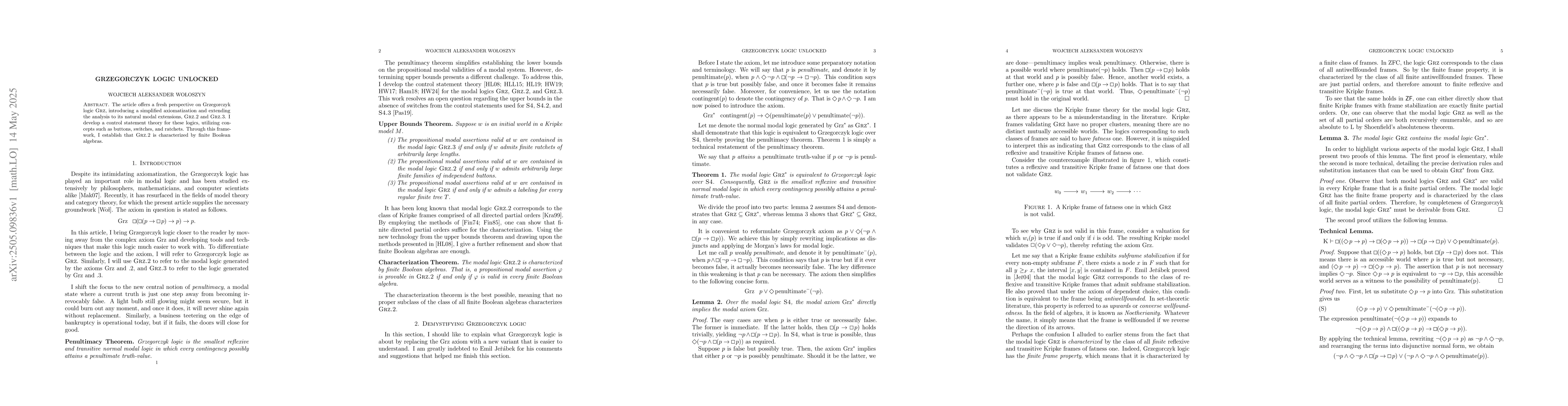 The paper simplifies the axiomatization of Grzegorczyk logic (Grz) and extends its analysis to modal extensions Grz.2 and Grz.3, developing a control statement theory using concepts like buttons, switches, and ratchets.