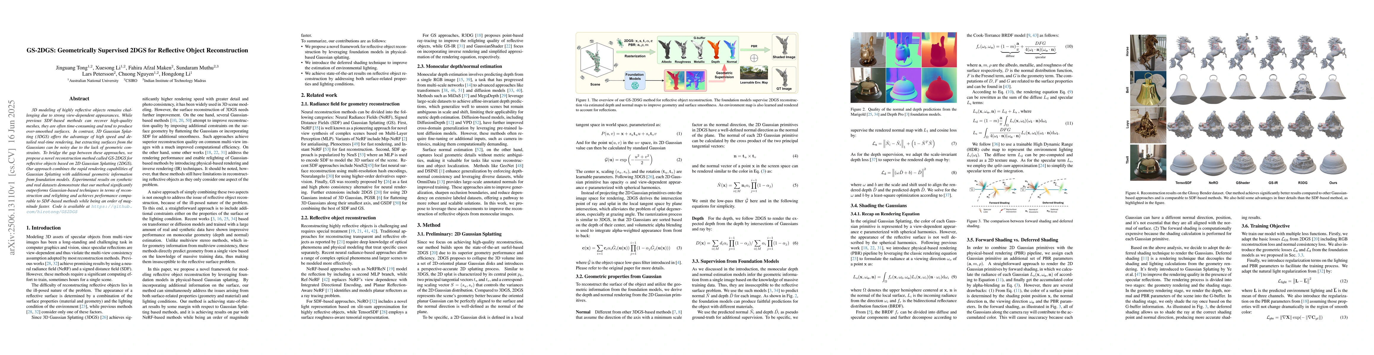 3D modeling of highly reflective objects remains challenging due to strong view-dependent appearances. While previous SDF-based methods can recover high-quality meshes, they are often time-consuming and tend to produce over-smoothed surfaces. In contrast, 3D Gaussian Splatting (3DGS) offers the advantage of high speed and detailed real-time rendering, but extracting surfaces from the Gaussians can be noisy due to the lack of geometric constraints. To bridge the gap between these approaches, we propose a novel reconstruction method called GS-2DGS for reflective objects based on 2D Gaussian Splatting (2DGS). Our approach combines the rapid rendering capabilities of Gaussian Splatting with additional geometric information from foundation models. Experimental results on synthetic and real datasets demonstrate that our method significantly outperforms Gaussian-based techniques in terms of reconstruction and relighting and achieves performance comparable to SDF-based methods while being an order of magnitude faster. Code is available at https://github.com/hirotong/GS2DGS