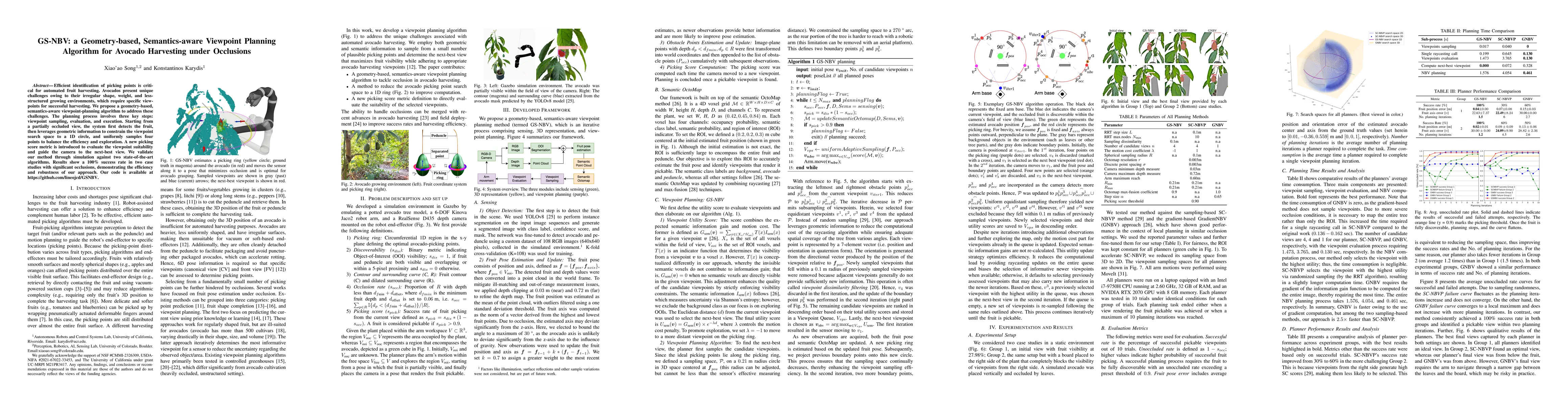 Efficient identification of picking points is critical for automated fruit harvesting. Avocados present unique challenges owing to their irregular shape, weight, and less-structured growing environments, which require specific viewpoints for successful harvesting. We propose a geometry-based, semantics-aware viewpoint-planning algorithm to address these challenges. The planning process involves three key steps: viewpoint sampling, evaluation, and execution. Starting from a partially occluded view, the system first detects the fruit, then leverages geometric information to constrain the viewpoint search space to a 1D circle, and uniformly samples four points to balance the efficiency and exploration. A new picking score metric is introduced to evaluate the viewpoint suitability and guide the camera to the next-best view. We validate our method through simulation against two state-of-the-art algorithms. Results show a 100% success rate in two case studies with significant occlusions, demonstrating the efficiency and robustness of our approach. Our code is available at https://github.com/lineojcd/GSNBV