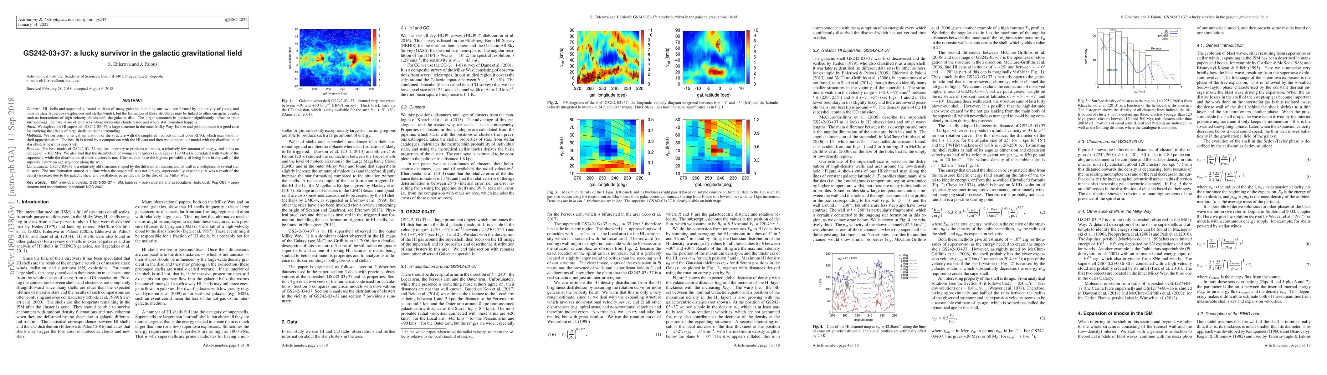 HI shells and supershells, found in discs of many galaxies including our own, are formed by the activity of young and massive stars (supernova explosions and stellar winds), but the formation of these structures may be linked to other energetic events, such as interactions of high-velocity clouds with the galactic disc. The larger structures in particular significantly influence their surroundings; their walls are often places where molecular clouds reside and where star formation happens. We explore the HI supershell GS242-03+37, a large structure in the outer Milky Way. Its size and position make it a good case for studying the effects of large shells on their surrounding. We perform numerical simulations of the structure with the simplified hydrodynamical code RING, which uses the thin-shell approximation. The best fit is found by a comparison with the HI data and then we compare our model with the distribution of star clusters near this supershell. The best model of GS242-03+37 requires, contrary to previous estimates, a relatively low amount of energy, and it has an old age of $\sim$ 100 Myr. We also find that the distribution of young star clusters (with ages $<$ 120 Myr) is correlated with walls of the supershell, while the distribution of older clusters is not. Clusters that have the highest probability of being born in the wall of the supershell show an age sequence along the wall. GS242-03+37 is a relatively old structure, shaped by the differential rotation, and its wall is a birthplace of several star clusters. The star formation started at a time when the supershell was not already supersonically expanding; it was a result of the density increase due to the galactic shear and oscillations perpendicular to the disc of the Milky Way.