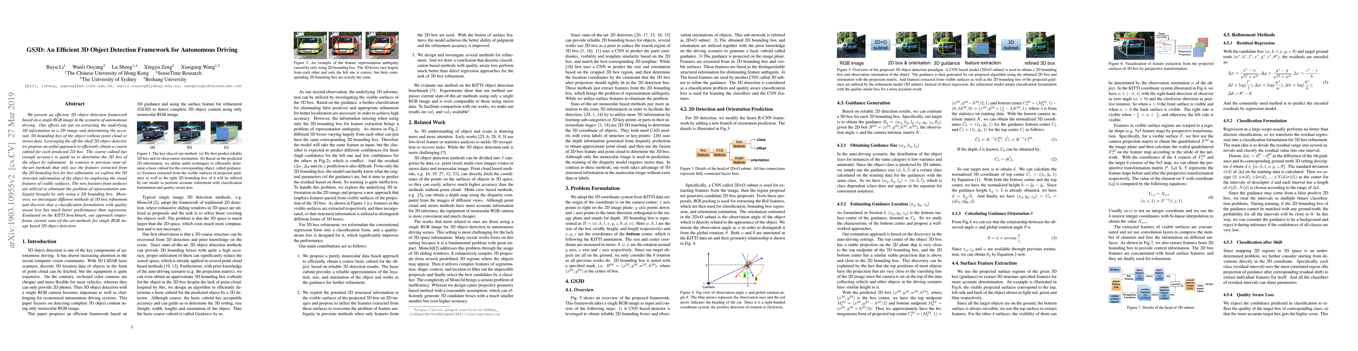 GS3D is an efficient 3D object detection framework for autonomous driving that extracts 3D information from single RGB images without requiring point cloud or stereo data. It refines 2D detections using visual features from object surfaces to determine accurate 3D bounding boxes, outperforming existing methods on the KITTI benchmark.