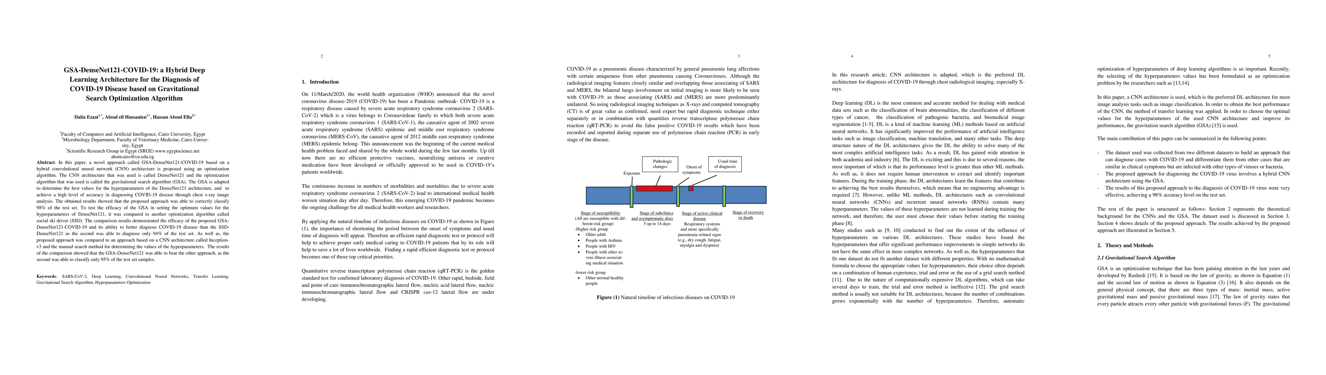 This research introduces a hybrid deep learning architecture named GSA-DenseNet121-COVID-19 for diagnosing COVID-19 using chest x-ray images. It combines DenseNet121 with the gravitational search optimization algorithm to optimize hyperparameters, achieving a 98% accuracy rate in classifying test samples. Comparative studies show superior performance over other methods, including social ski driver optimization and Inception-v3 CNN.
