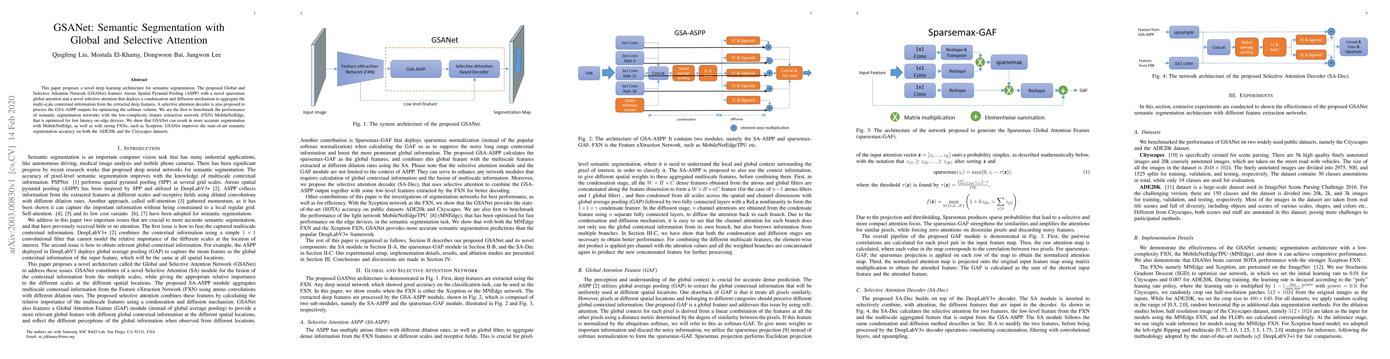 GSANet introduces a novel deep learning architecture for semantic segmentation using global and selective attention mechanisms, achieving state-of-the-art accuracy on ADE20k and Cityscapes datasets. It combines Atrous Spatial Pyramid Pooling with sparsemax global attention and a selective attention decoder, optimized for both low latency and high performance.