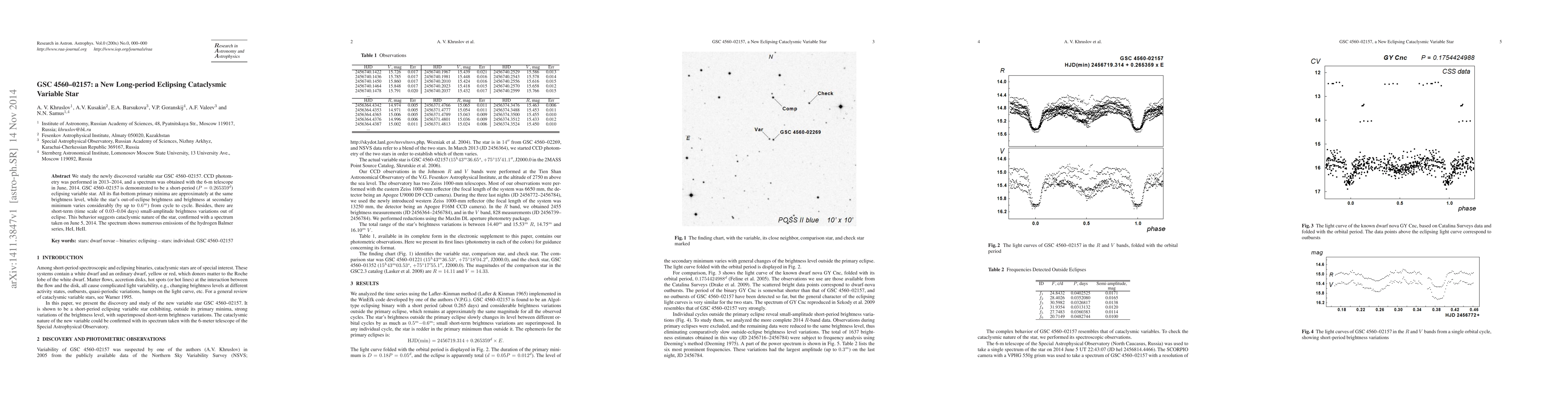 We study the newly discovered variable star GSC 4560--02157. CCD photometry was performed in 2013--2014, and a spectrum was obtained with the 6-m telescope in June, 2014. GSC 4560--02157 is demonstrated to be a short-period (P=0.265359d) eclipsing variable star. All its flat-bottom primary minima are approximately at the same brightness level, while the star's out-of-eclipse brightness and brightness at secondary minimum varies considerably (by up to 0.6m) from cycle to cycle. Besides, there are short-term (time scale of 0.03-0.04 days) small-amplitude brightness variations out of eclipse. This behavior suggests cataclysmic nature of the star, confirmed with a spectrum taken on June 5, 2014. The spectrum shows numerous emissions of the hydrogen Balmer series, HeI, HeII.