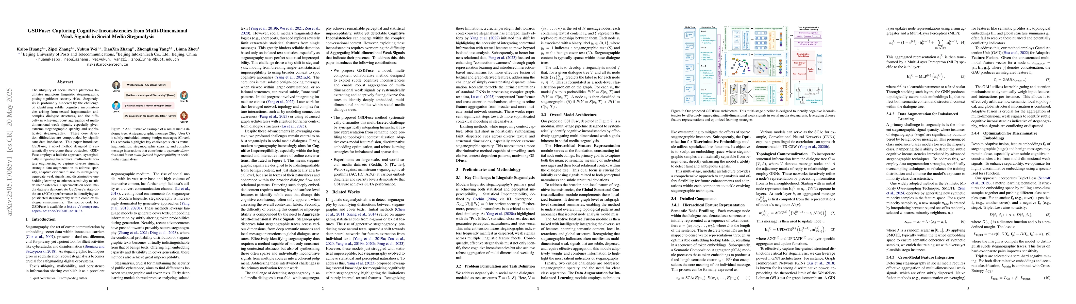 A new method called GSDFuse is introduced to detect sophisticated steganography in social media by capturing cognitive inconsistencies through a holistic approach that integrates multi-modal features, data augmentation, adaptive fusion, and discriminative embedding learning. It achieves state-of-the-art performance in identifying complex dialogue environments.