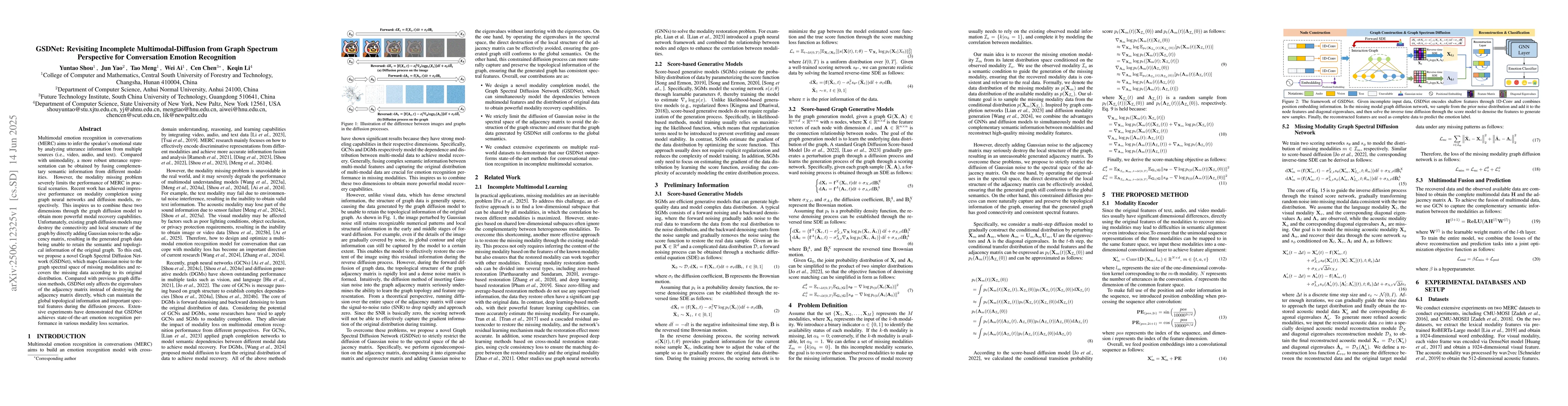 Multimodal emotion recognition in conversations (MERC) aims to infer the speaker's emotional state by analyzing utterance information from multiple sources (i.e., video, audio, and text). Compared with unimodality, a more robust utterance representation can be obtained by fusing complementary semantic information from different modalities. However, the modality missing problem severely limits the performance of MERC in practical scenarios. Recent work has achieved impressive performance on modality completion using graph neural networks and diffusion models, respectively. This inspires us to combine these two dimensions through the graph diffusion model to obtain more powerful modal recovery capabilities. Unfortunately, existing graph diffusion models may destroy the connectivity and local structure of the graph by directly adding Gaussian noise to the adjacency matrix, resulting in the generated graph data being unable to retain the semantic and topological information of the original graph. To this end, we propose a novel Graph Spectral Diffusion Network (GSDNet), which maps Gaussian noise to the graph spectral space of missing modalities and recovers the missing data according to its original distribution. Compared with previous graph diffusion methods, GSDNet only affects the eigenvalues of the adjacency matrix instead of destroying the adjacency matrix directly, which can maintain the global topological information and important spectral features during the diffusion process. Extensive experiments have demonstrated that GSDNet achieves state-of-the-art emotion recognition performance in various modality loss scenarios.