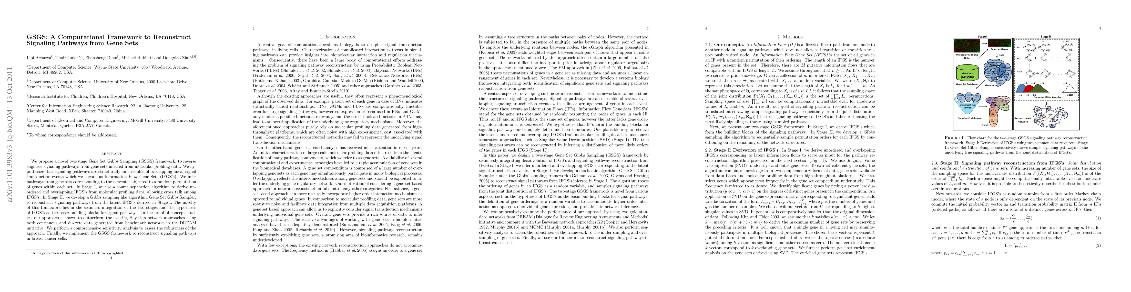 This research introduces GSGS, a two-stage computational framework to reconstruct signaling pathways from gene sets. It uses Information Flow Gene Sets (IFGS) and a Gene Set Gibbs Sampler, outperforming Bayesian network approaches in simulations and demonstrating robustness and applicability in breast cancer cell pathway reconstruction.