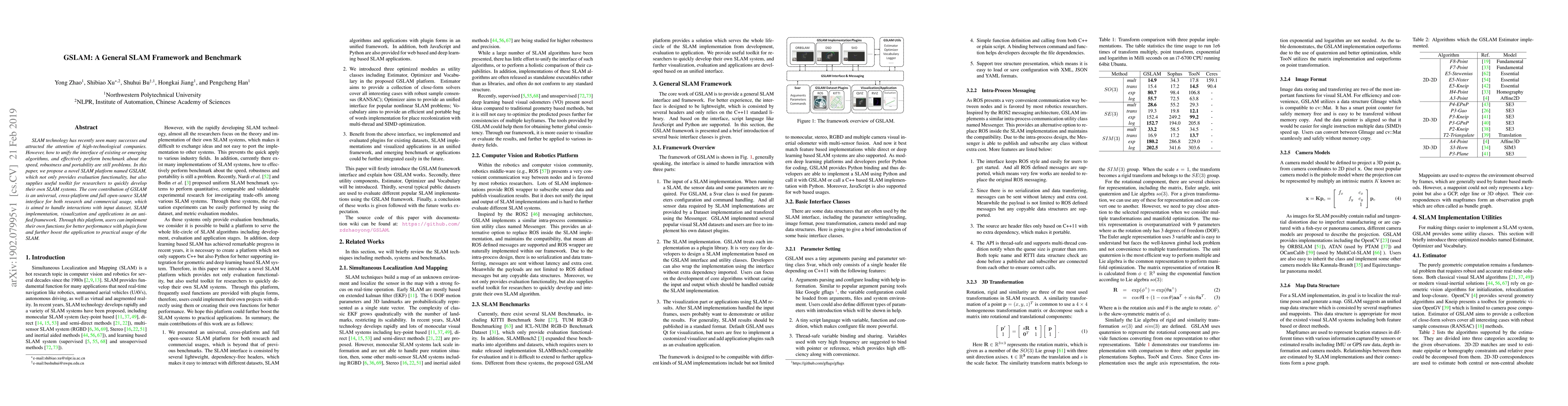 SLAM technology has recently seen many successes and attracted the attention of high-technological companies. However, how to unify the interface of existing or emerging algorithms, and effectively perform benchmark about the speed, robustness and portability are still problems. In this paper, we propose a novel SLAM platform named GSLAM, which not only provides evaluation functionality, but also supplies useful toolkit for researchers to quickly develop their own SLAM systems. The core contribution of GSLAM is an universal, cross-platform and full open-source SLAM interface for both research and commercial usage, which is aimed to handle interactions with input dataset, SLAM implementation, visualization and applications in an unified framework. Through this platform, users can implement their own functions for better performance with plugin form and further boost the application to practical usage of the SLAM.