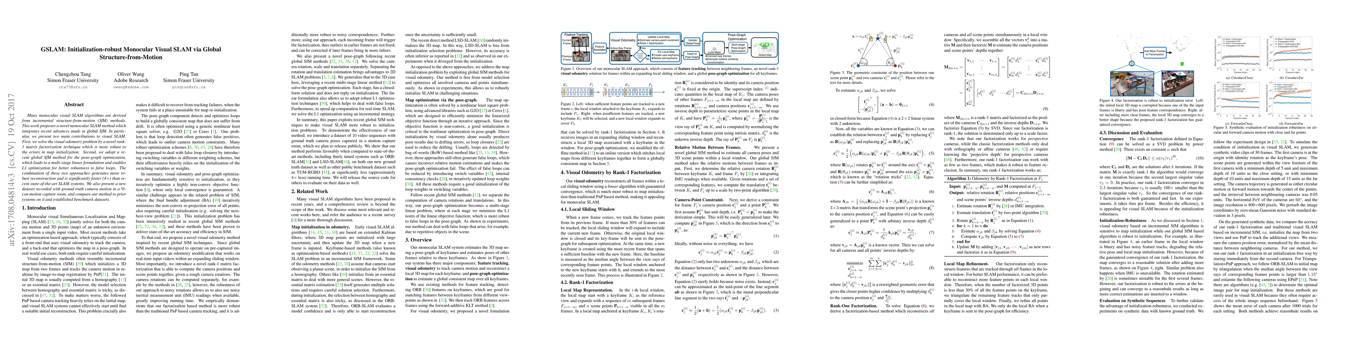 This paper introduces GSLAM, a robust monocular visual SLAM system that leverages global structure-from-motion techniques. It employs a rank-1 matrix factorization for robust visual odometry and a global SfM method for pose-graph optimization, resulting in faster and more accurate reconstruction compared to existing methods.