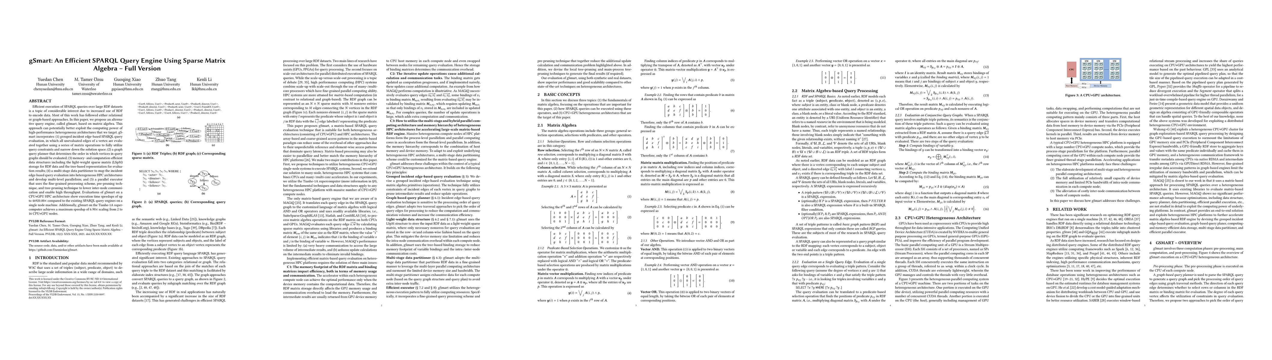 gSmart proposes an efficient SPARQL query engine leveraging sparse matrix algebra to exploit high-performance heterogeneous architectures, achieving significant speedups over existing engines on both single-node and multi-node HPC systems. It employs grouped incident edge-based evaluation, a graph query planner, sparse matrix storage, and parallel execution techniques.