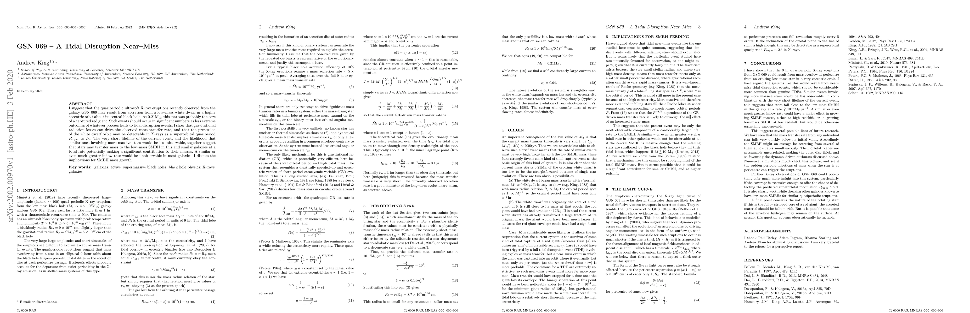 I suggest that the quasiperiodic ultrasoft X-ray eruptions recently observed from the galaxy GSN 069 may result from accretion from a low-mass white dwarf in a highly eccentric orbit about its central black hole. At 0.21M_sun, this star was probably the core of a captured red giant. Such events should occur in significant numbers as less extreme outcomes of whatever process leads to tidal disruption events. I show that gravitational radiation losses can drive the observed mass transfer rate, and that the precession of the white dwarf orbit may be detectable in X-rays as a superorbital quasiperiod P_super ~ 2 d. The very short lifetime of the current event, and the likelihood that similar ones involving more massive stars would be less observable, together suggest that stars may transfer mass to the low-mass SMBH in this and similar galaxies at a total rate potentially making a significant contribution to their masses. A similar or even much greater inflow rate would be unobservable in most galaxies. I discuss the implications for SMBH mass growth.
