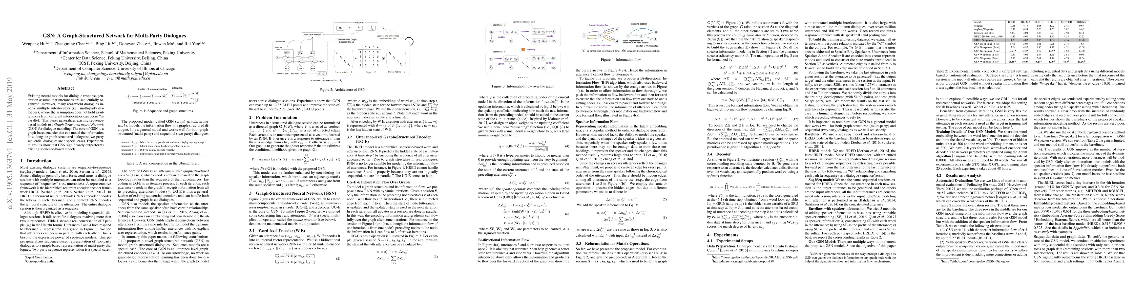 This paper proposes a Graph-Structured Network (GSN) for multi-party dialogue response generation, addressing the limitations of sequence-based models by employing a graph-based encoder to model parallel interactions among multiple interlocutors. Experimental results demonstrate that GSN outperforms existing sequential models.