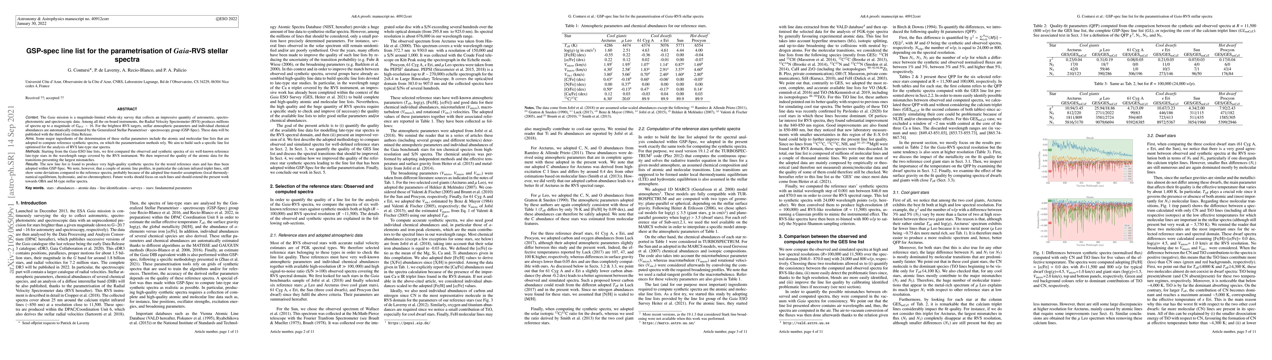 The Gaia mission is a magnitude-limited whole-sky survey that collects an impressive quantity of astrometric, spectro-photometric and spectroscopic data. Among all the on-board instruments, the Radial Velocity Spectrometer (RVS) produces millions of spectra up to a magnitude of G$_{RVS} \sim 16$. For the brightest RVS targets, stellar atmospheric parameters and individual chemical abundances are automatically estimated by the Generalized Stellar Parametriser - spectroscopy group (GSP-Spec). These data will be published with the third Gaia Data Release. Some major ingredients of the determination of these stellar parameters include the atomic and molecular line lists that are adopted to compute reference synthetic spectra, on which the parametrisation methods rely. We aim to build such a specific line list optimised for the analysis of RVS late-type star spectra. Starting from the Gaia-ESO line lists, we first compared the observed and synthetic spectra of six well-known reference late-type stars in the wavelength range covered by the RVS instrument. We then improved the quality of the atomic data for the transitions presenting the largest mismatches. The new line list is found to produce very high-quality synthetic spectra for the tested reference stars and has thus been adopted within GSP-Spec.