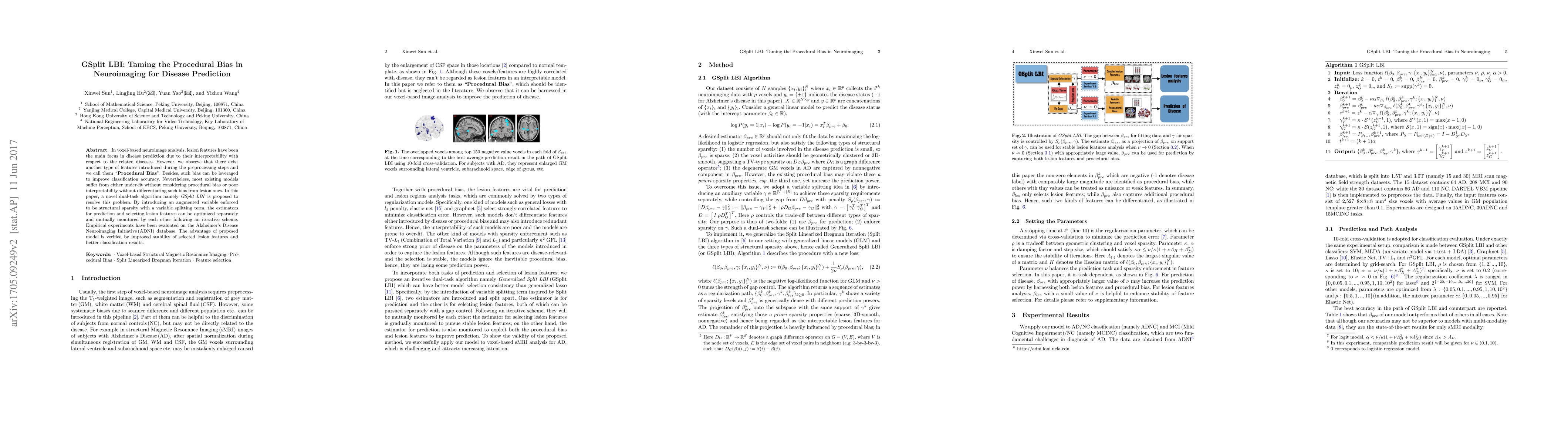 This research introduces 'Procedural Bias' in neuroimage analysis for disease prediction, distinct from lesion features. A new algorithm, GSplit LBI, is proposed to separately optimize prediction and lesion feature selection, enhancing stability and classification accuracy in Alzheimer's disease studies on the ADNI database.