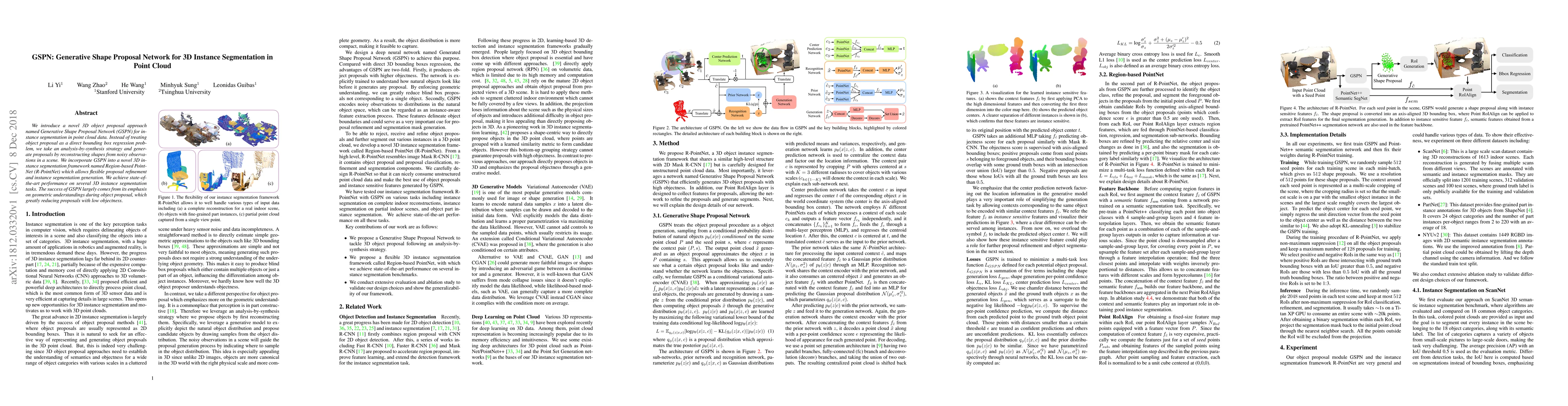 The GSPN generates 3D object proposals through shape reconstruction from noisy point cloud observations, integrated into R-PointNet for flexible refinement and instance segmentation, achieving top performance by focusing on geometric understanding.