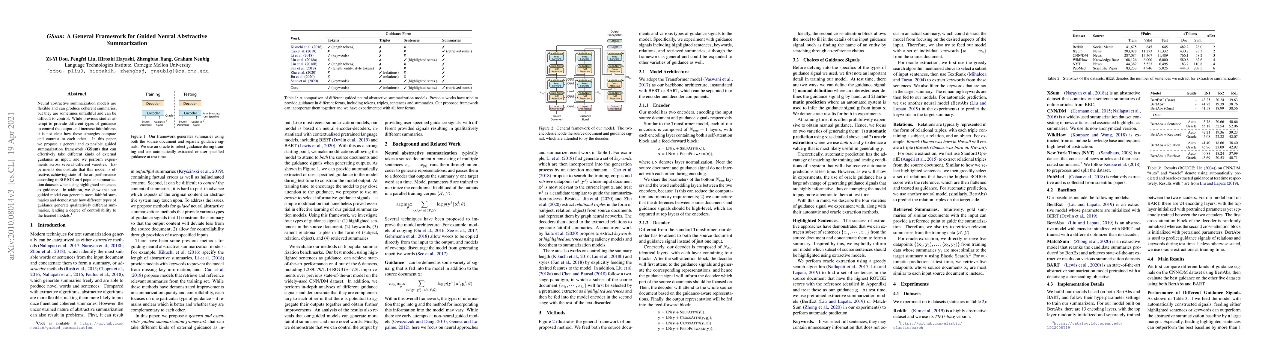 The paper introduces GSum, a versatile framework for guided neural abstractive summarization that can incorporate various types of external guidance to enhance control and faithfulness. Experiments show GSum achieves top performance on summarization datasets and offers improved control over summary generation.