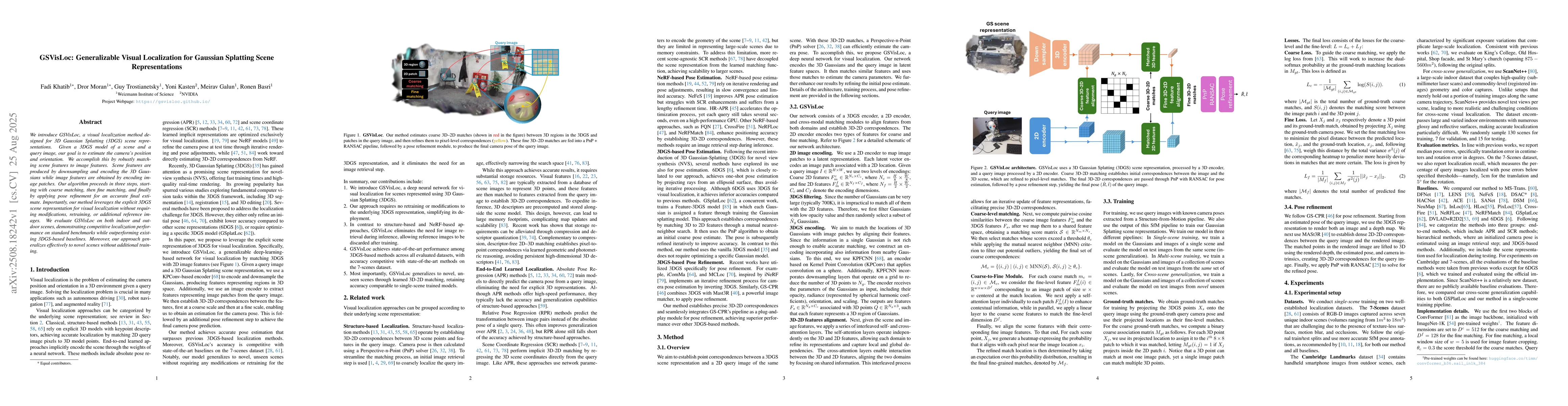 We introduce GSVisLoc, a visual localization method designed for 3D Gaussian Splatting (3DGS) scene representations. Given a 3DGS model of a scene and a query image, our goal is to estimate the camera's position and orientation. We accomplish this by robustly matching scene features to image features. Scene features are produced by downsampling and encoding the 3D Gaussians while image features are obtained by encoding image patches. Our algorithm proceeds in three steps, starting with coarse matching, then fine matching, and finally by applying pose refinement for an accurate final estimate. Importantly, our method leverages the explicit 3DGS scene representation for visual localization without requiring modifications, retraining, or additional reference images. We evaluate GSVisLoc on both indoor and outdoor scenes, demonstrating competitive localization performance on standard benchmarks while outperforming existing 3DGS-based baselines. Moreover, our approach generalizes effectively to novel scenes without additional training.