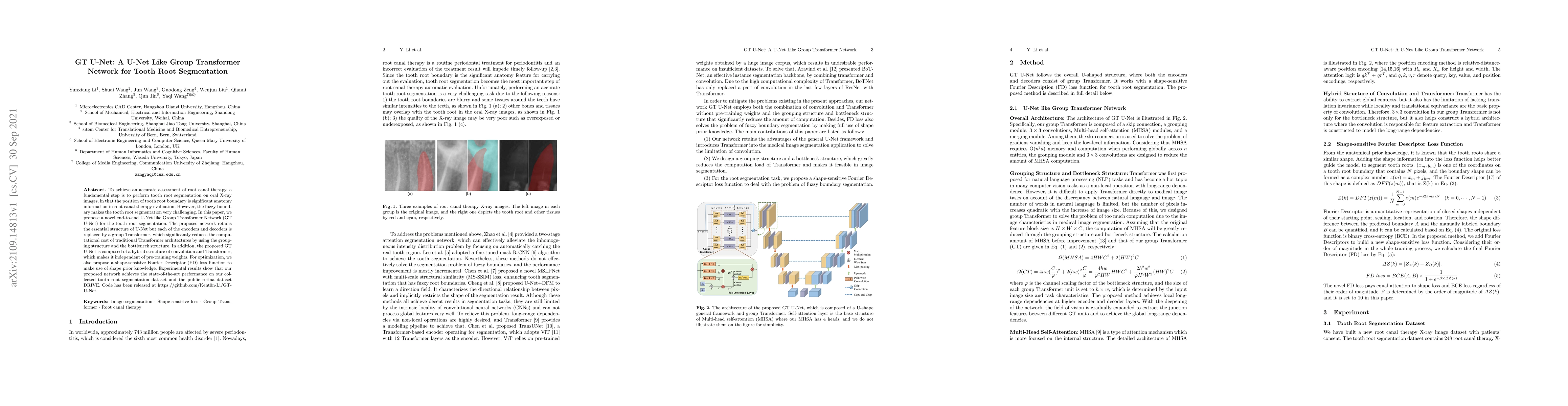 This paper presents a novel GT U-Net, a U-Net-like Group Transformer Network for tooth root segmentation in oral X-ray images. The GT U-Net replaces traditional encoders and decoders with group Transformers, reducing computational costs and leveraging a hybrid convolutional-Transformer structure for improved segmentation performance.