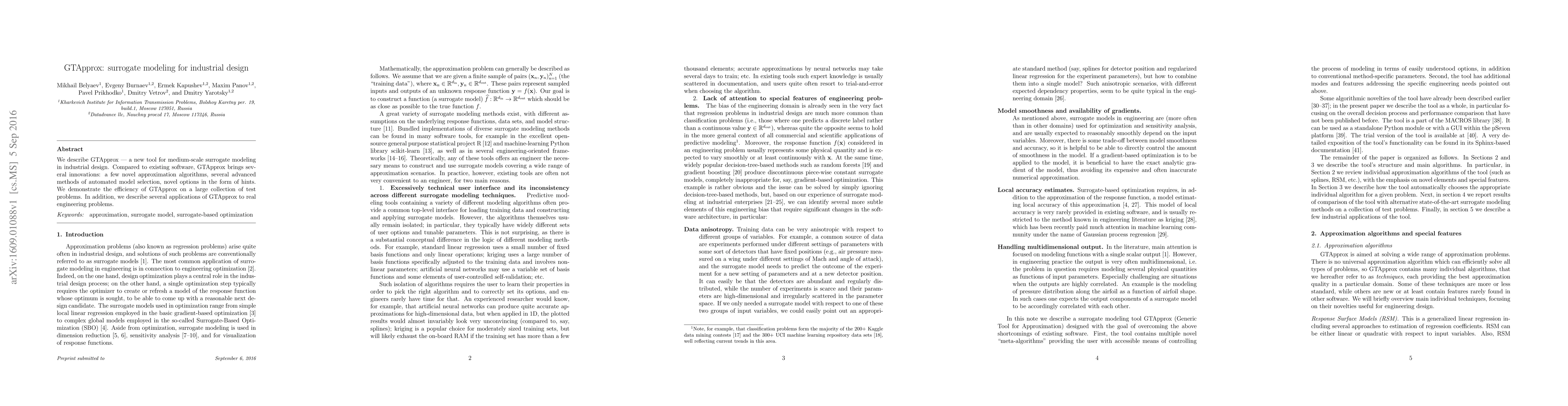 We describe GTApprox - a new tool for medium-scale surrogate modeling in industrial design. Compared to existing software, GTApprox brings several innovations: a few novel approximation algorithms, several advanced methods of automated model selection, novel options in the form of hints. We demonstrate the efficiency of GTApprox on a large collection of test problems. In addition, we describe several applications of GTApprox to real engineering problems.