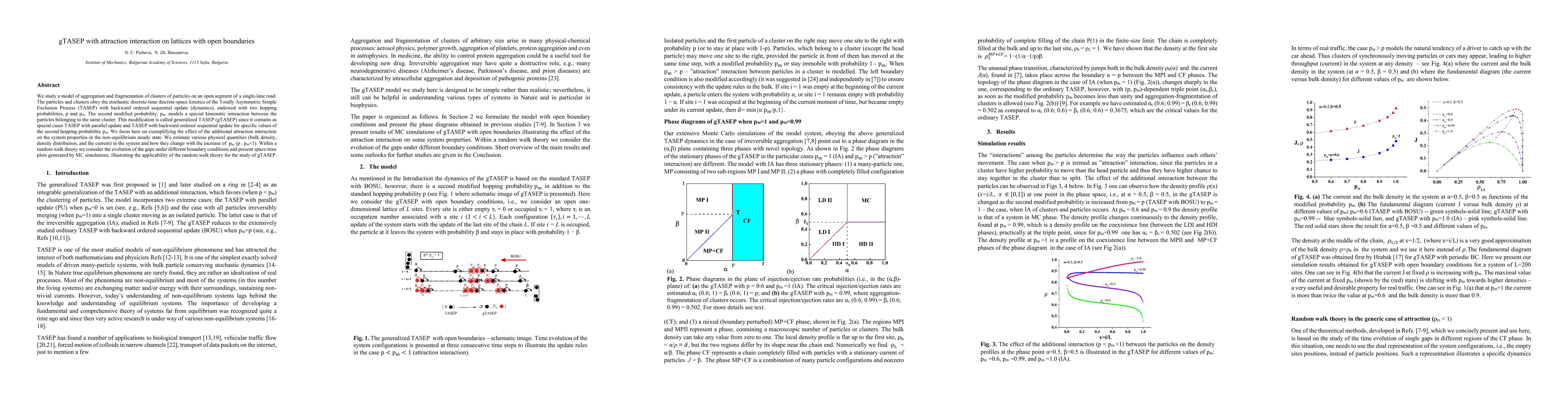 We study a model of aggregation and fragmentation of clusters of particles on an open segment of a single-lane road. The particles and clusters obey the stochastic discrete-time discrete-space kinetics of the Totally Asymmetric Simple Exclusion Process (TASEP) with backward ordered sequential update (dynamics), endowed with two hopping probabilities, p and pm. The second modified probability, pm, models a special kinematic interaction between the particles belonging to the same cluster. This modification is called generalized TASEP (gTASEP) since it contains as special cases TASEP with parallel update and TASEP with backward ordered sequential update for specific values of the second hopping probability pm. We focus here on exemplifying the effect of the additional attraction interaction on the system properties in the non-equilibrium steady state. We estimate various physical quantities (bulk density, density distribution, and the current) in the system and how they change with the increase of pm (p < pm<1). Within a random walk theory we consider the evolution of the gaps under different boundary conditions and present space-time plots generated by MC simulations, illustrating the applicability of the random walk theory for the study of gTASEP.